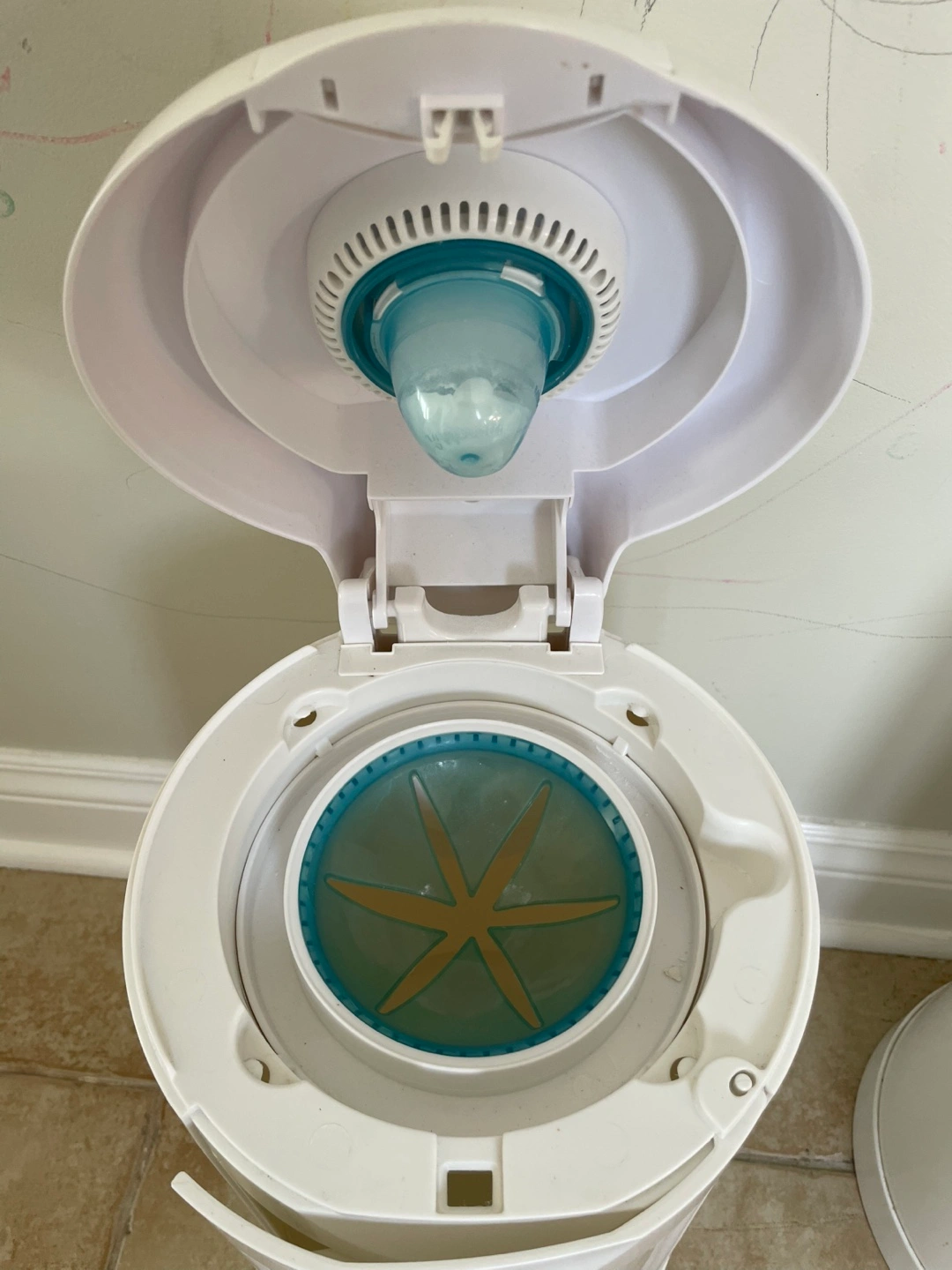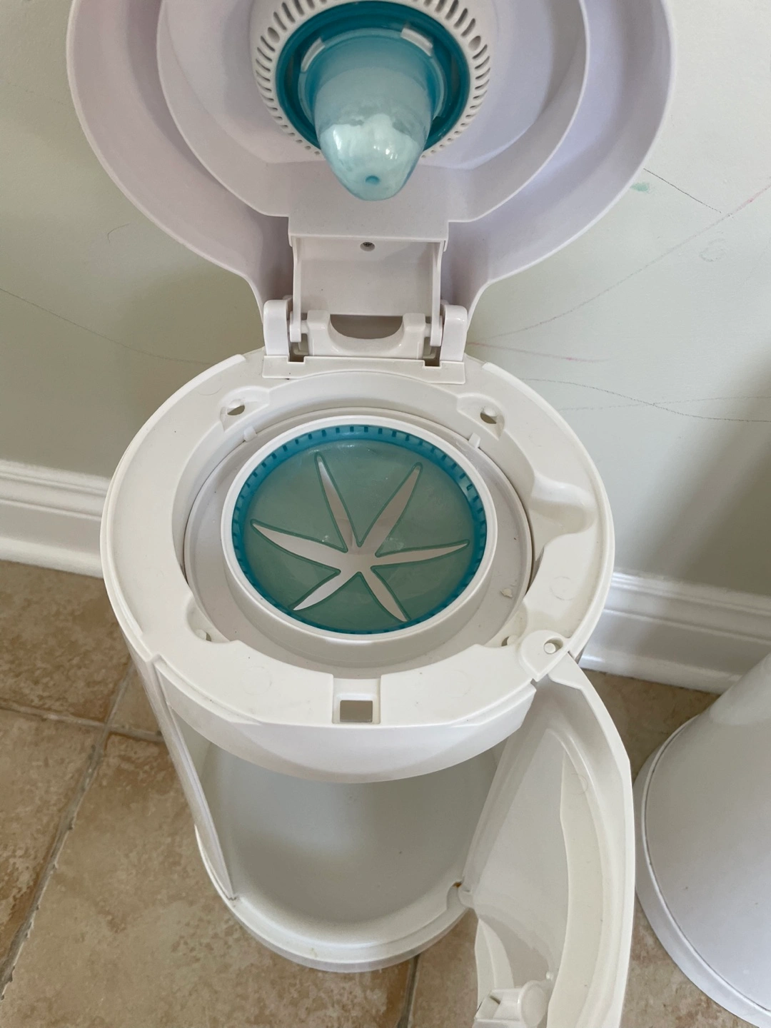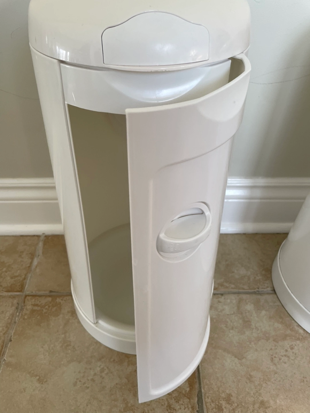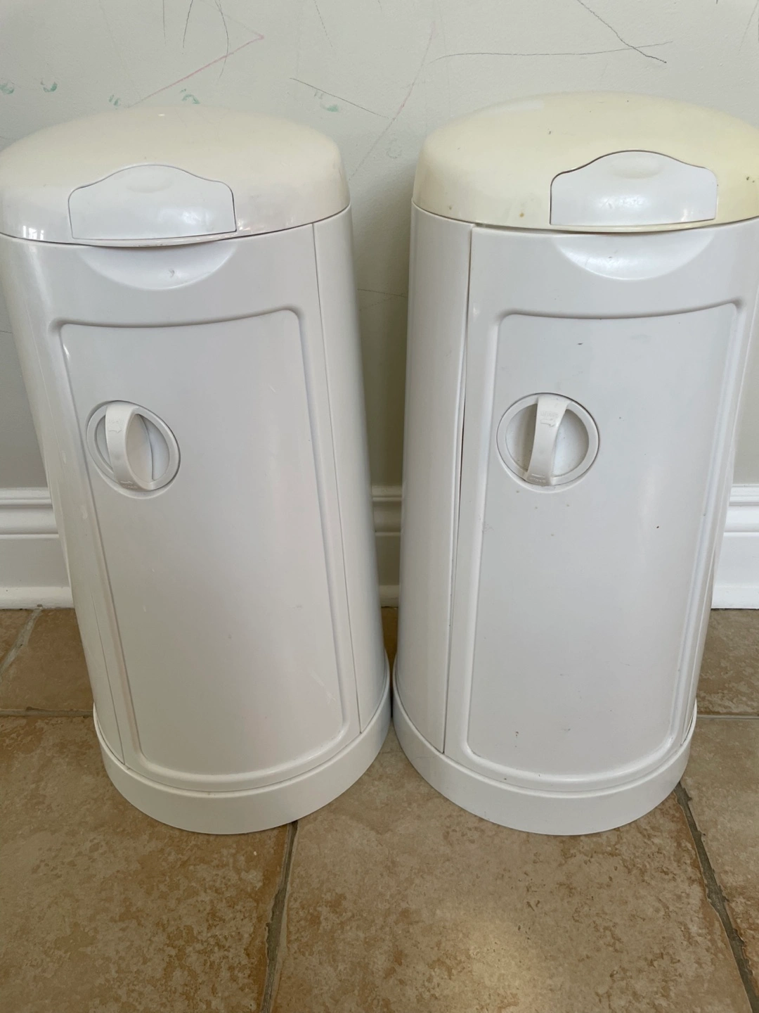 Two white diaper pails. Each has a hinged door and a top-loading mechanism. $20 for both or $10 each.