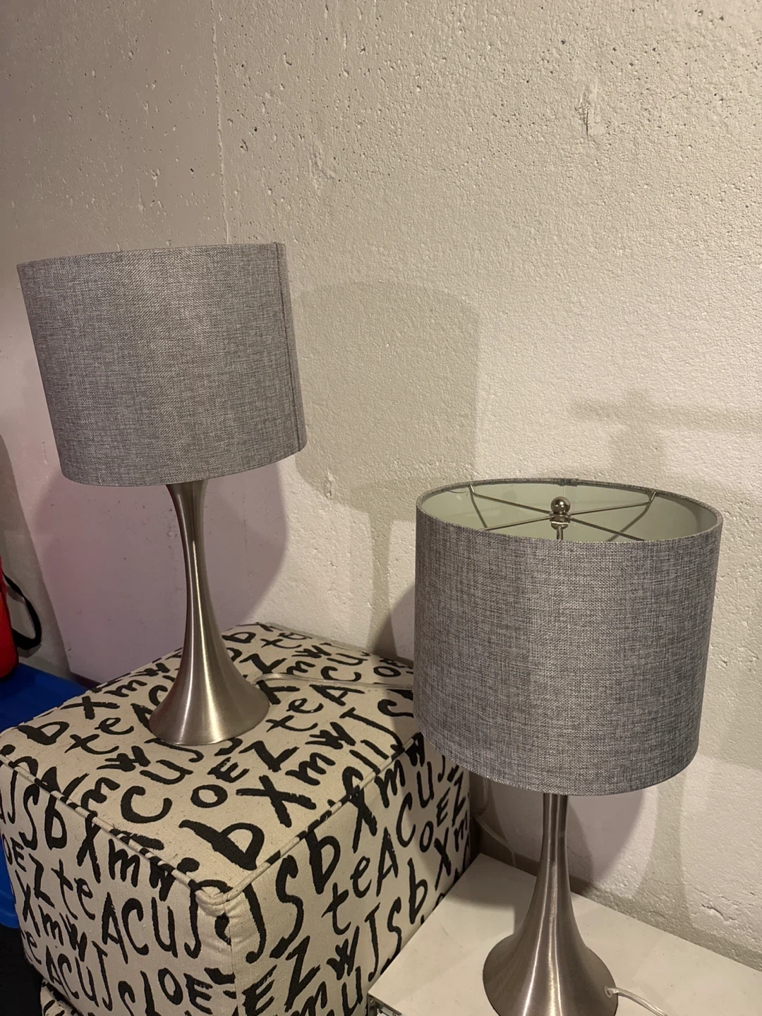 Selling a pair of grey table lamps! They're in great condition and would look lovely in any room. They have a sleek, modern design with a grey fabric shade and a silver-tone base. Perfect for bedside tables or a living room side table!