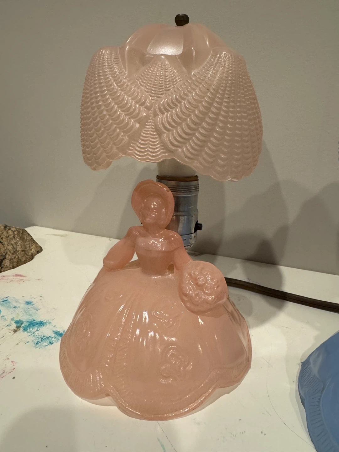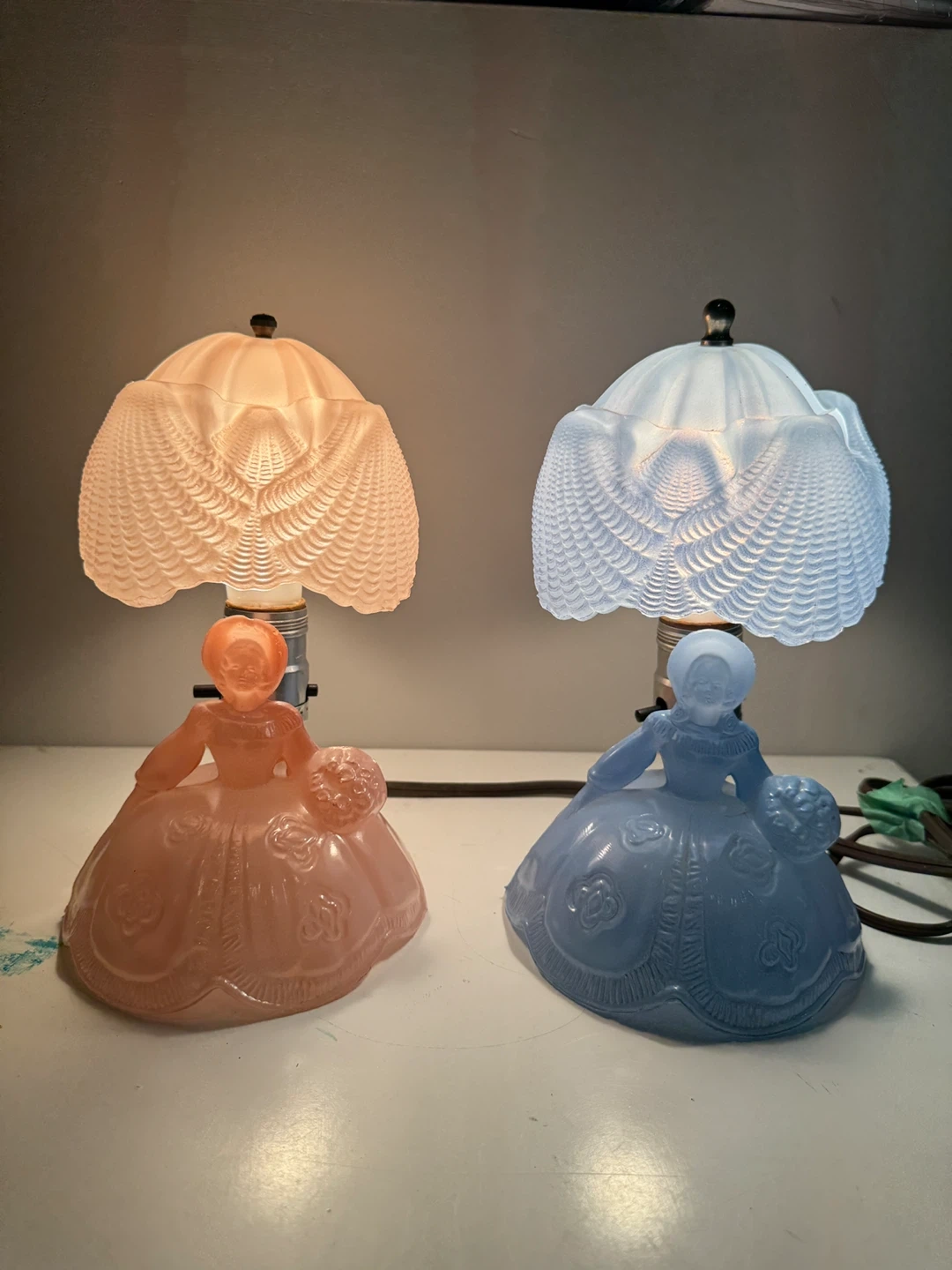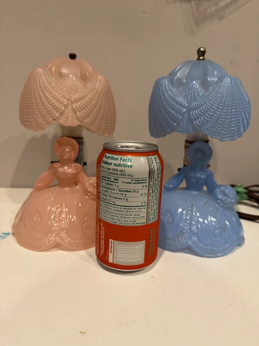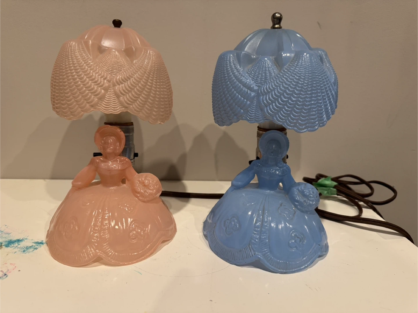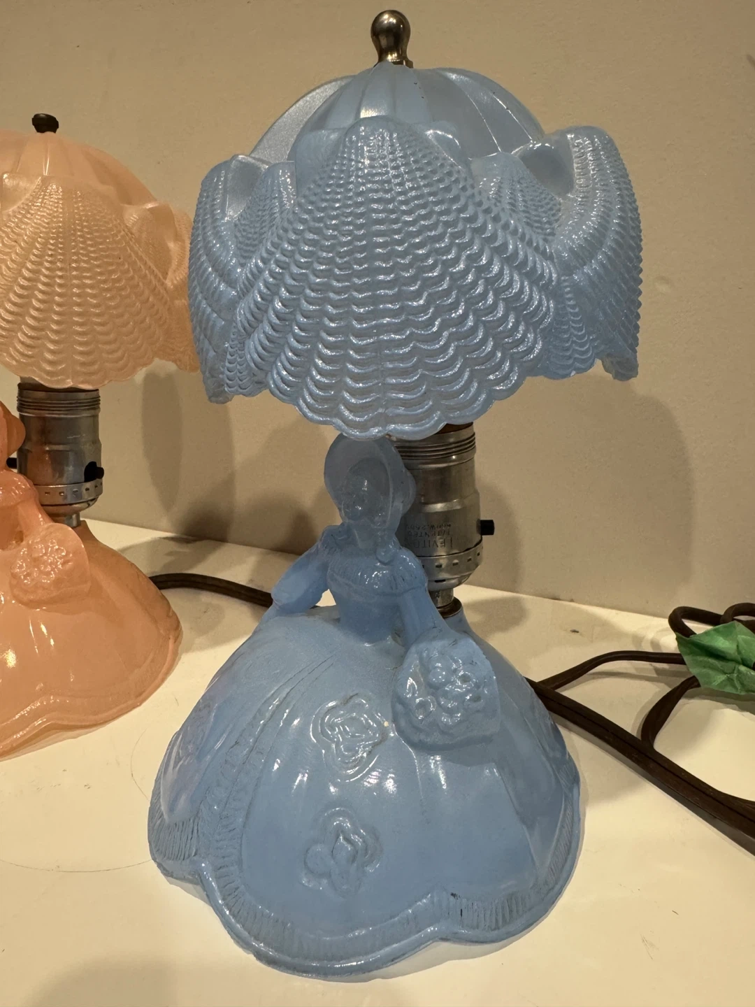 Pair of LE Smith Glass Southern Belle frosted boudoir lamps. Both work and are in good shape. One blue and one pink Selling for $125 for the pair Located in st adolphe but will meet in south end of city