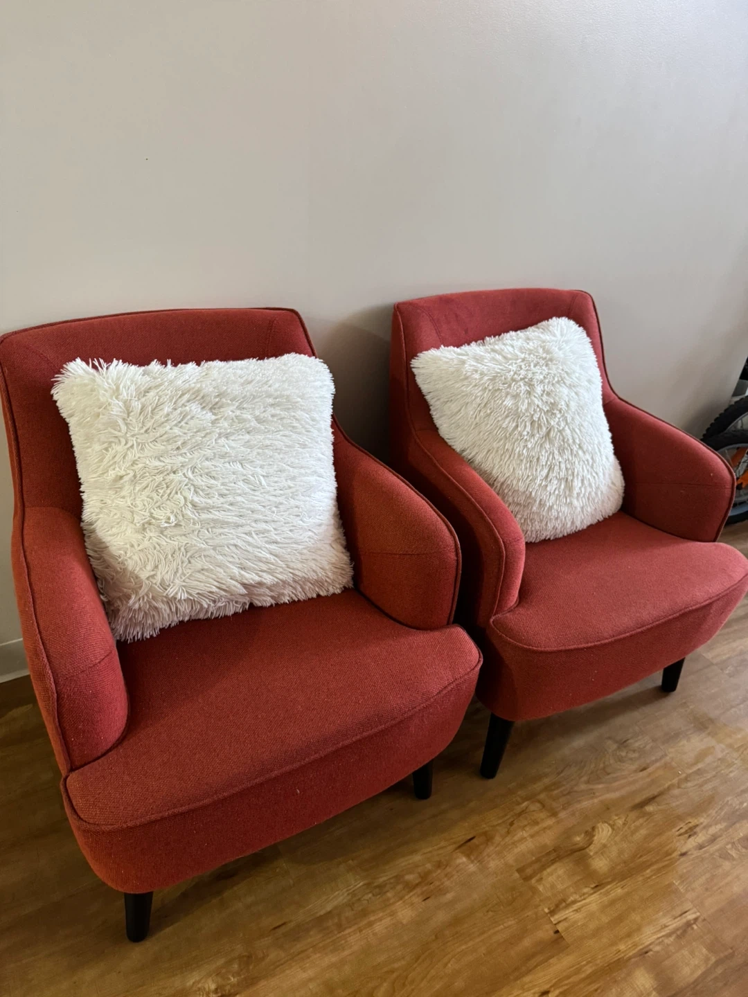 10Selling a pair of cozy red accent chairs! They come with fluffy white cushions, perfect for adding a pop of colour and comfort to any room. They're in great shape and ready for a new home