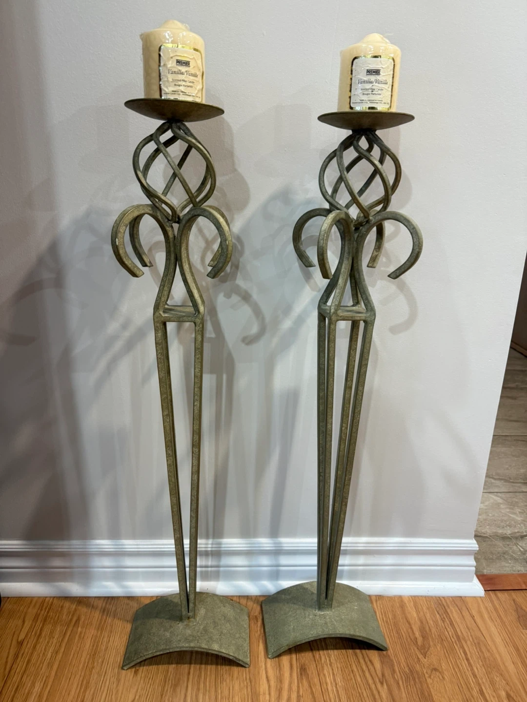 86Here's a set of two Premier candle holders, perfect for adding a touch of elegance to any room! They have a unique, twisted design and are in great condition. Almost 3ft tall with candles