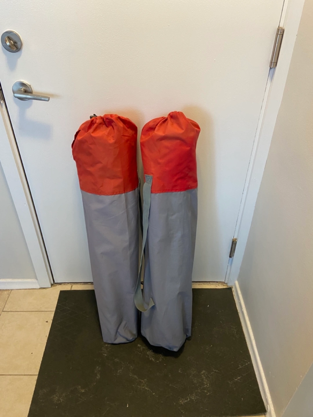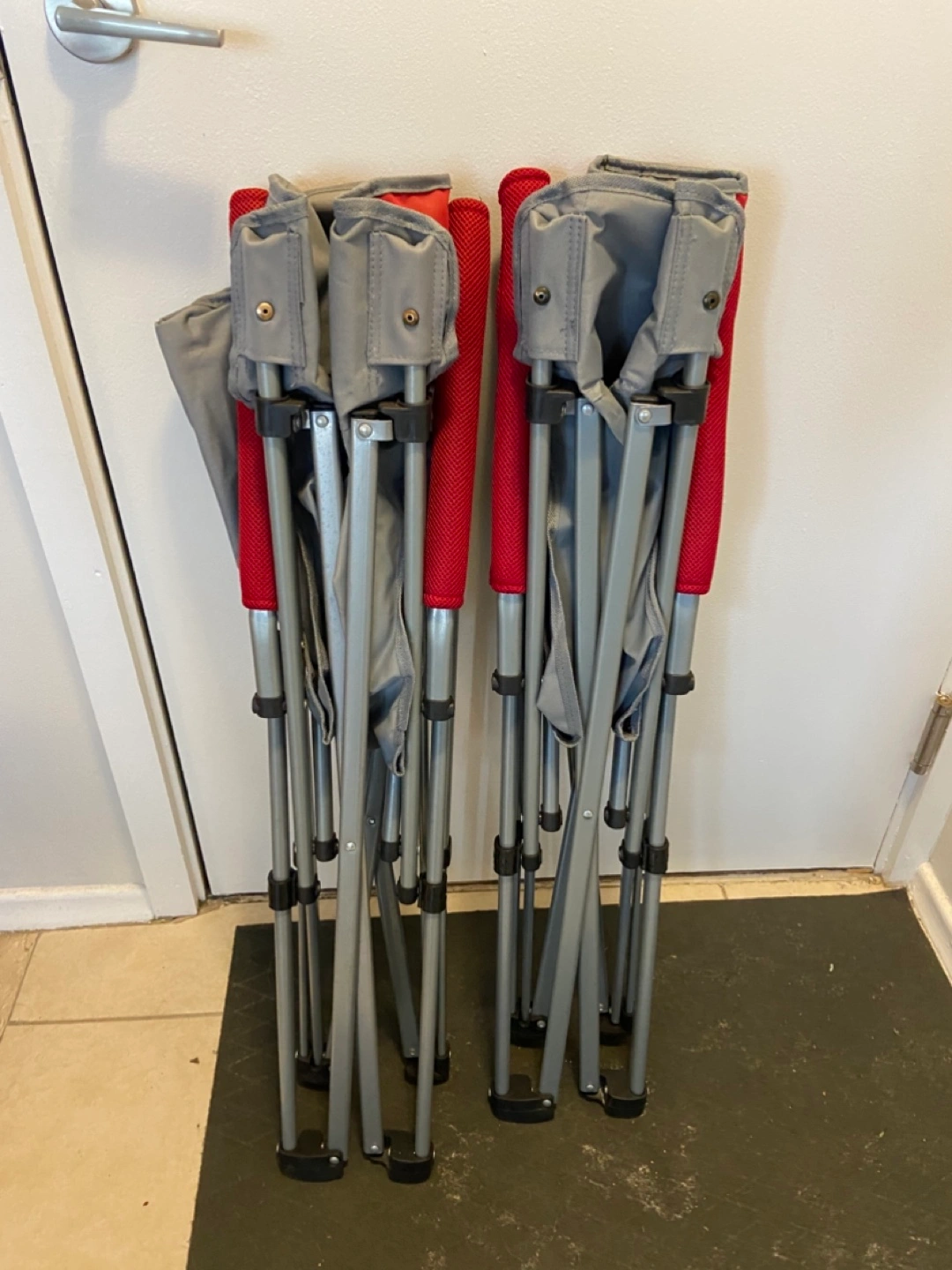 120Two portable folding chairs. Red and grey fabric. Grey metal frame. Easy to store and transport. Great for camping, picnics, or sporting events.