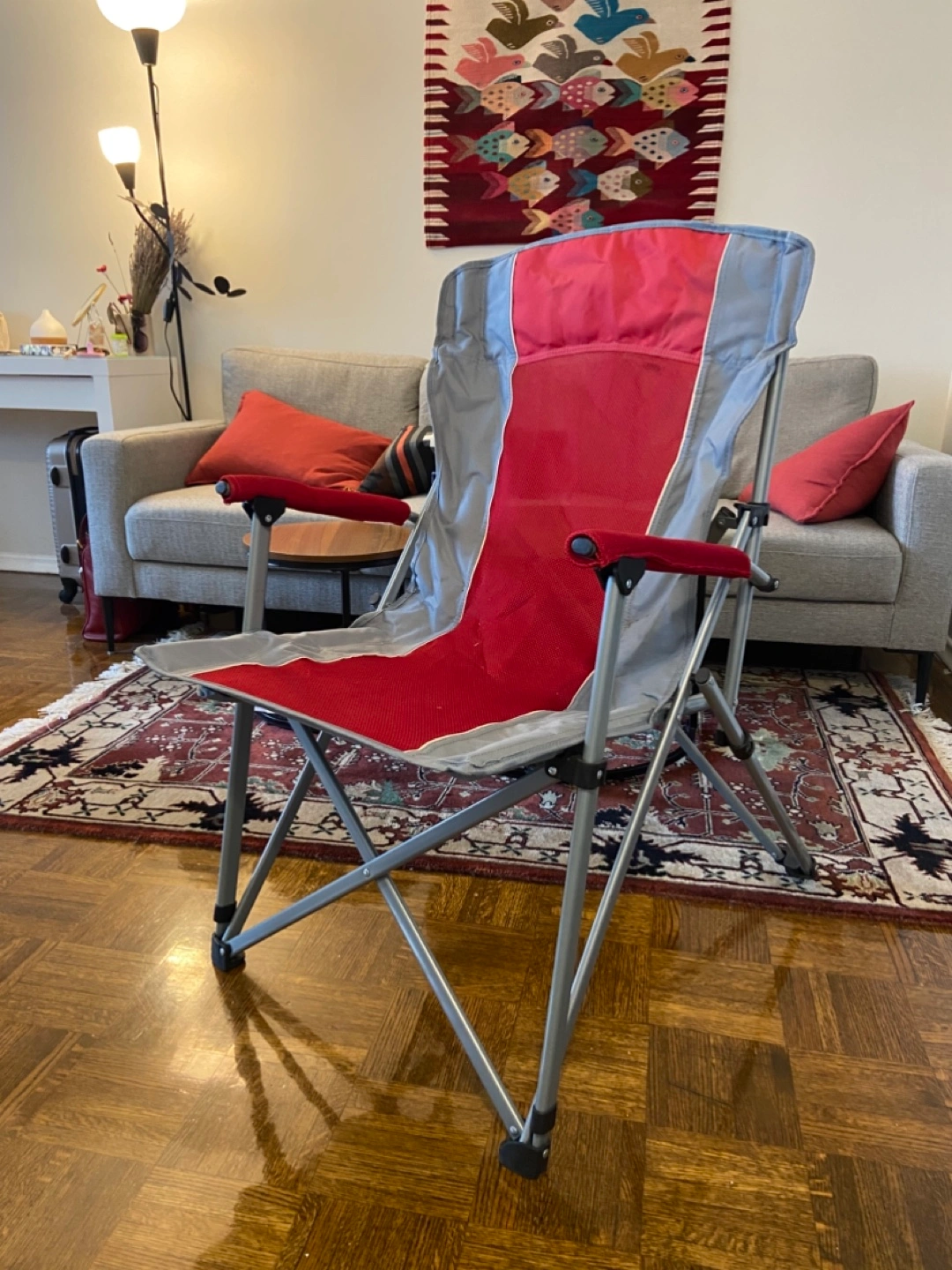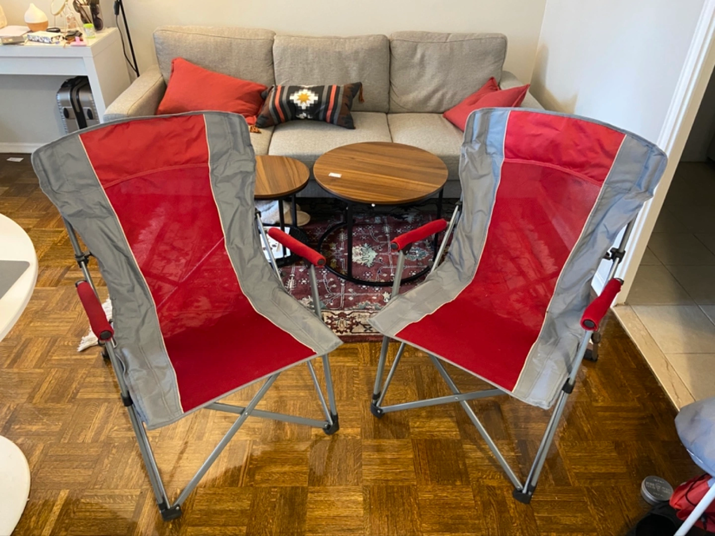 120Two portable folding chairs. Red and grey fabric. Grey metal frame. Easy to store and transport. Great for camping, picnics, or sporting events.