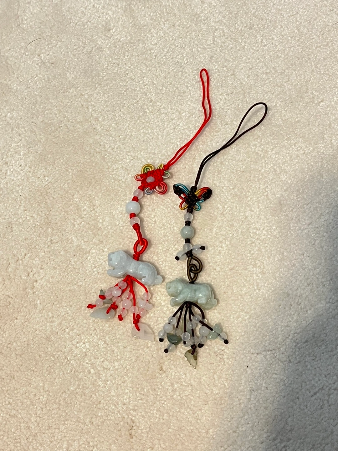 46Two decorative charms. Feature small tiger figurine, beads, and decorative knots. Payment by cash.