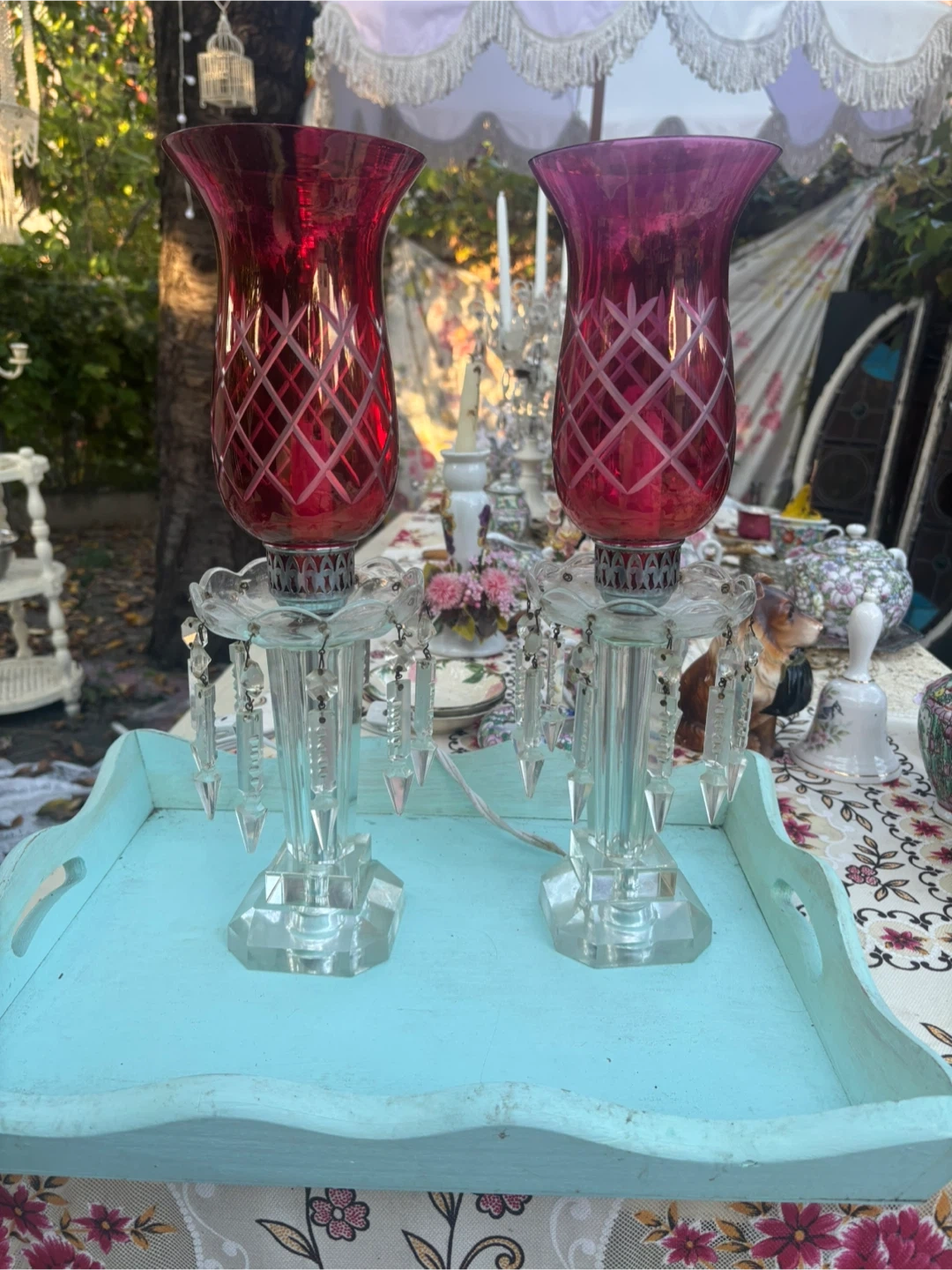 Pair of Vintage cranberry glass and crystal lamps mantle