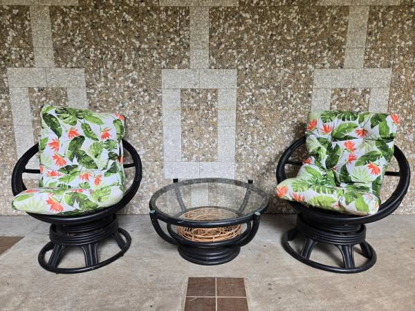 Pair of woven bamboo swivel chairs with brand new cushions and a matching round glass top coffee table Coffee table: 29 1/2 inch diameter 15 inch height Swivel chairs: 29 1/2(w) 28 1/4(d) 30 inch backrest height 16 inch seat height Pick up in downtown Vancouver or delivery may be arranged for a reasonable fee. Follow us on Instagram: https://www.instagram.com/west.end.trends Tags: retro vintage antique 1940s 1950s 1960s 1970s coastal modern Contemporary woven rattan bamboo wicker cane rocking swivel boho bohemian patio balcony deck backyard porch south east Asia Indonesia Malaysia Bali Thailand Malaysia Vietnam indoor outdoor egg chair womb chair peacock natural bentwood