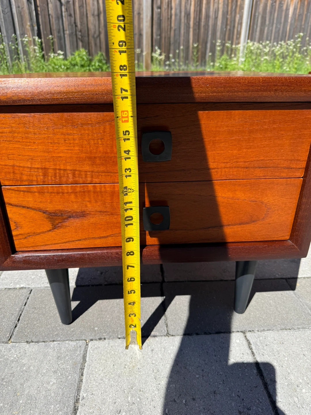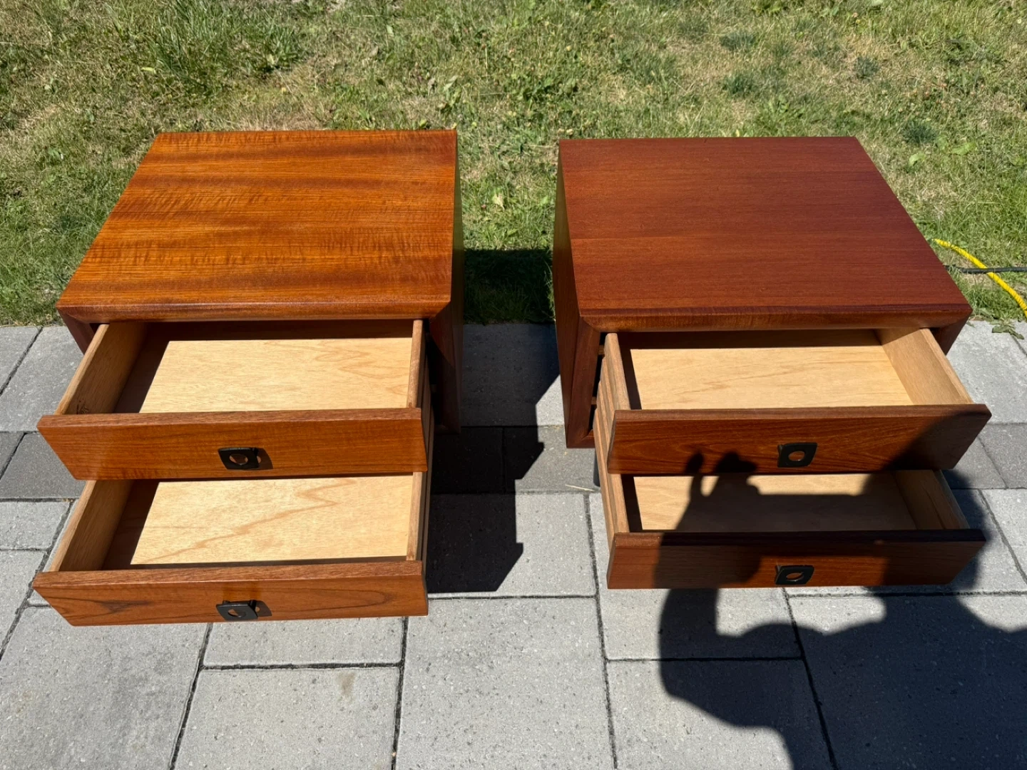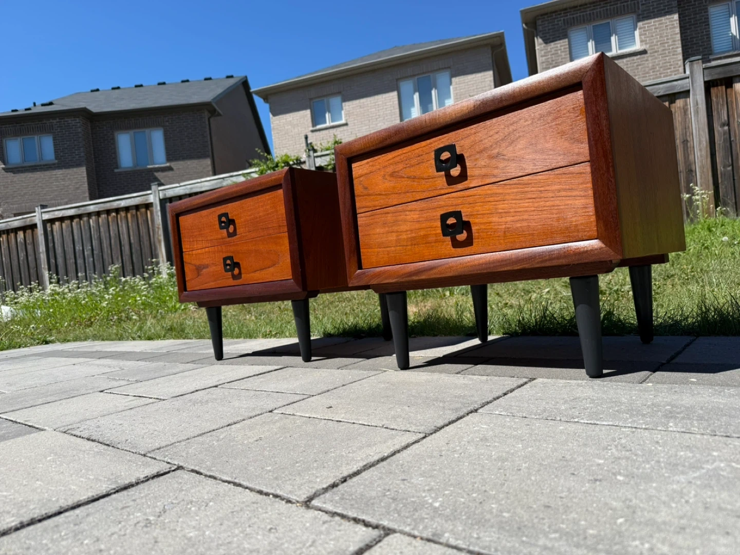 10Selling a pair of vintage teak nightstands. They feature a beautiful wood grain and unique drawer pulls. These are perfect for adding a touch of mid-century modern style to your bedroom!