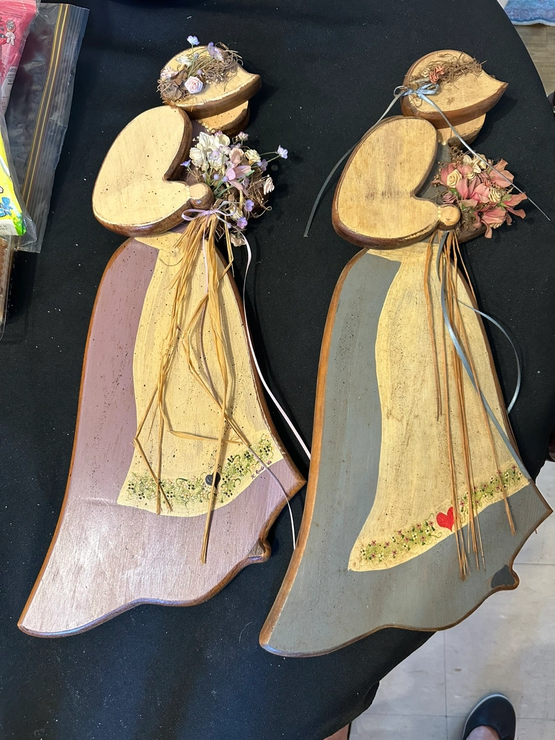 69Selling a cute pair of wooden ladies wall hangings. They're hand-painted and each one is holding a bouquet of flowers. Perfect for adding a touch of whimsy to any room!