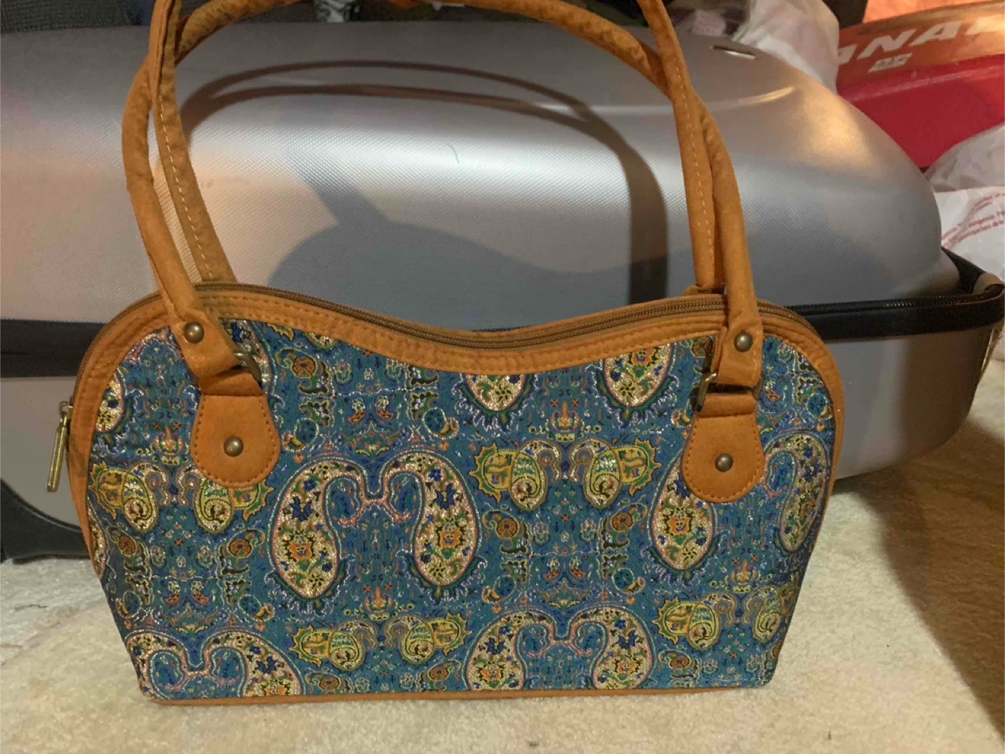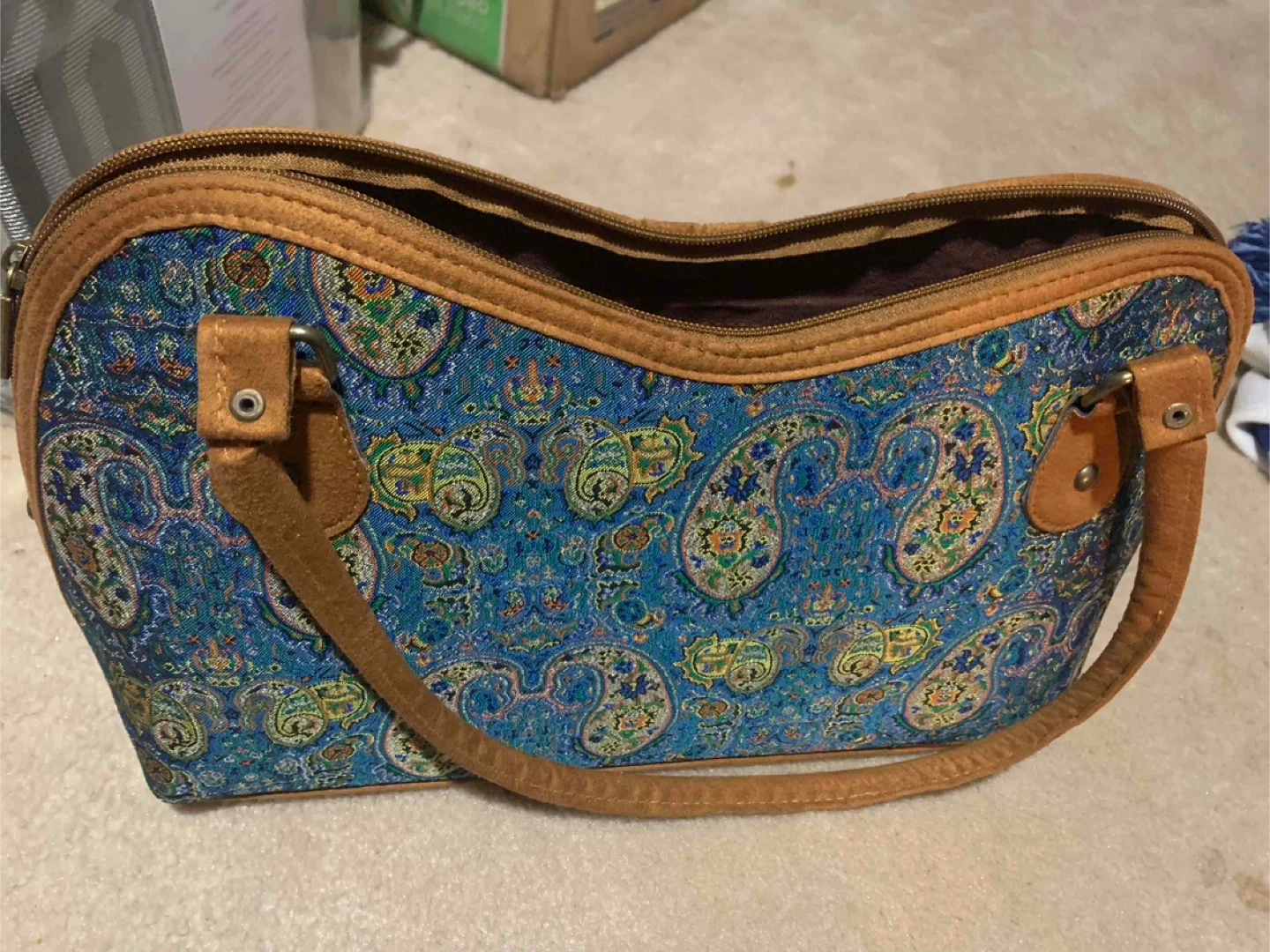 10A cute handbag with a blue paisley pattern! It has brown handles and trim, and a zippered closure. Perfect for carrying your essentials in style