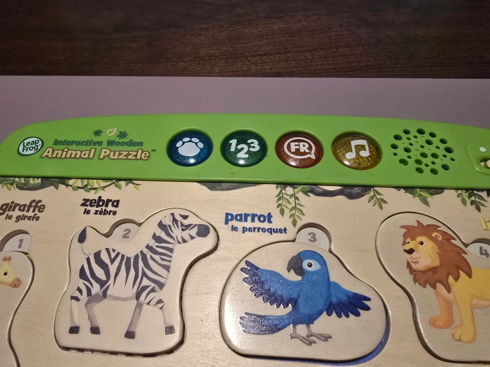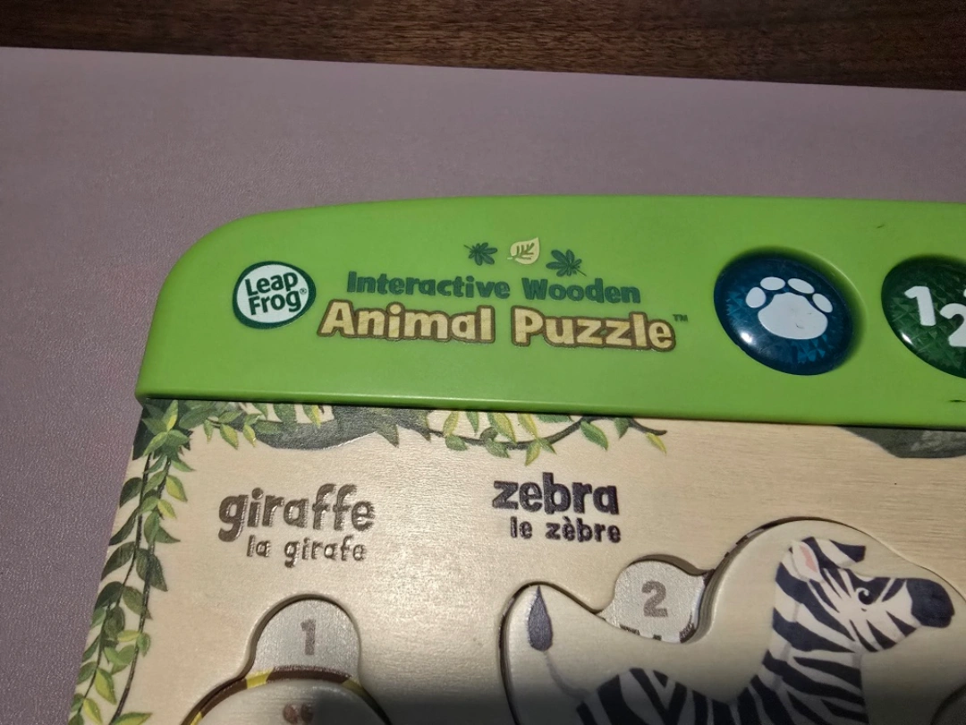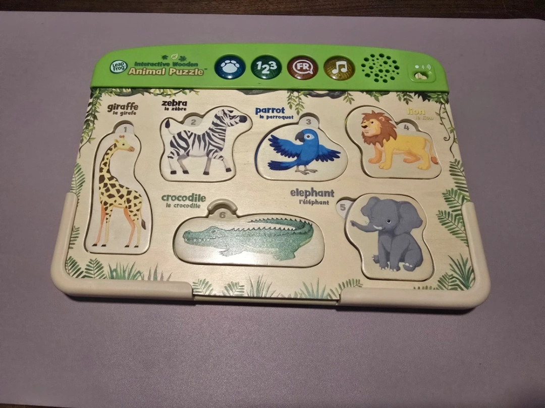 AI: Selling a LeapFrog Interactive Wooden Animal Puzzle. It's in great shape and ready for a new home! Features include animal sounds and French language mode. Perfect for toddlers learning about animals and languages