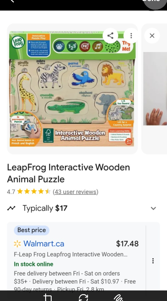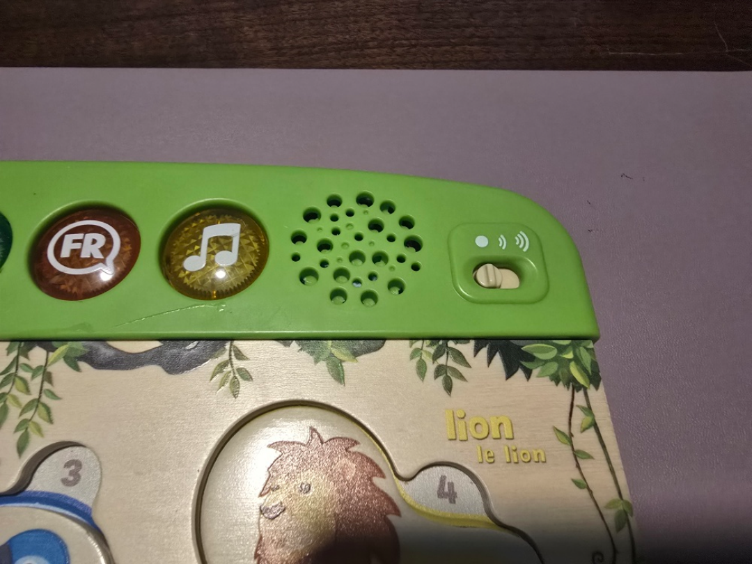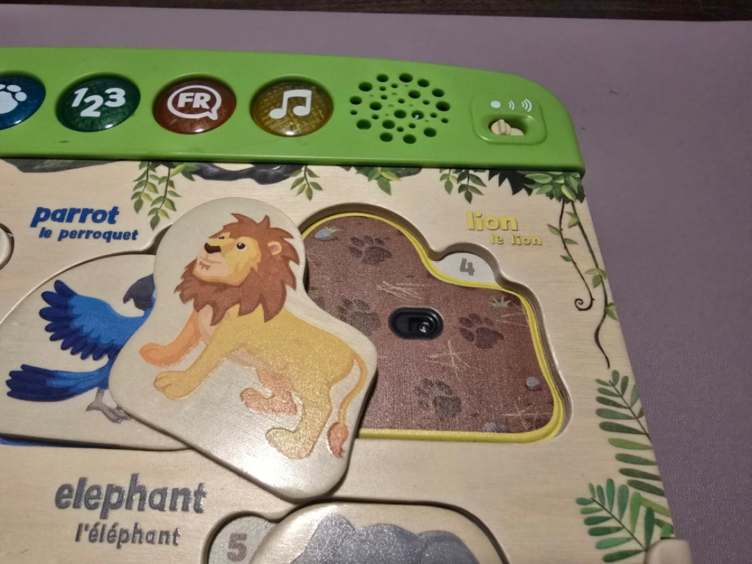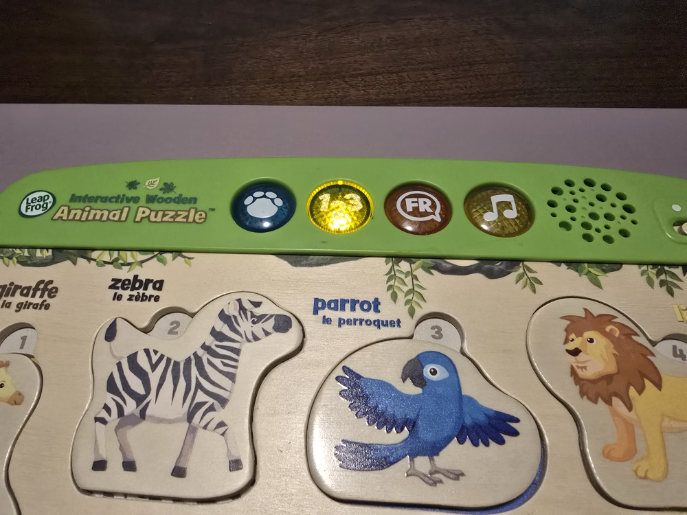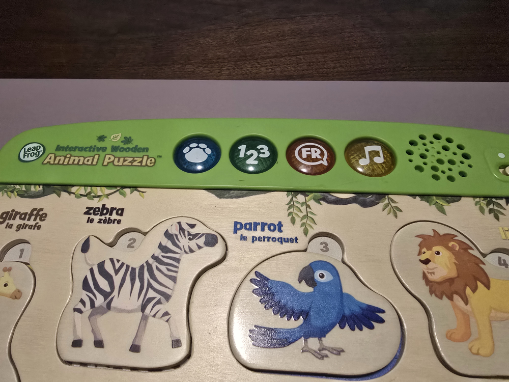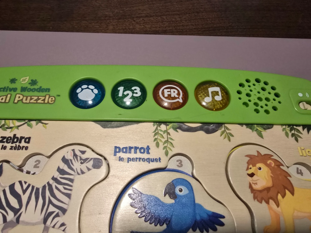 AI: Selling a LeapFrog Interactive Wooden Animal Puzzle. It's in great shape and ready for a new home! Features include animal sounds and French language mode. Perfect for toddlers learning about animals and languages