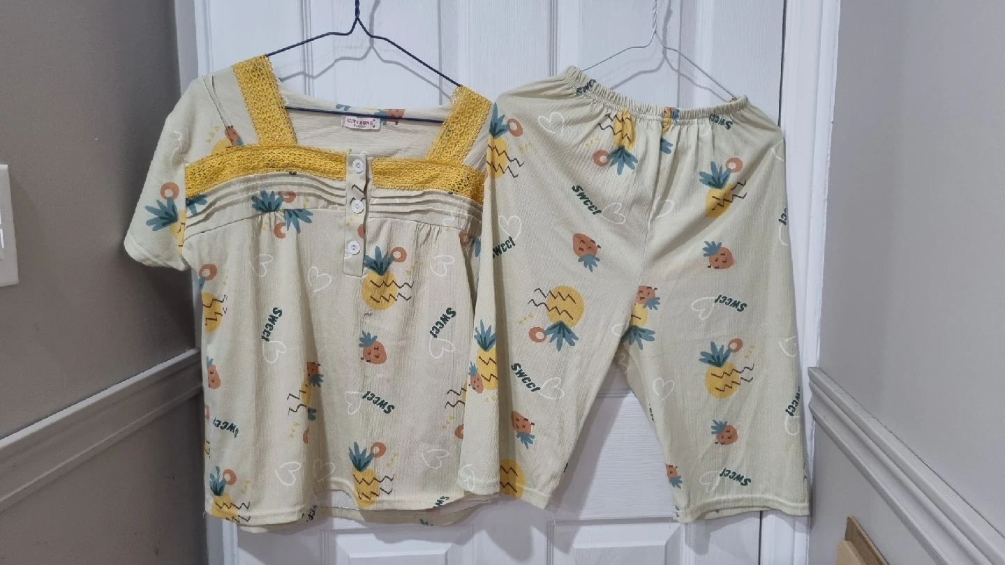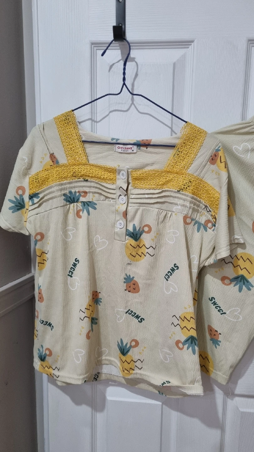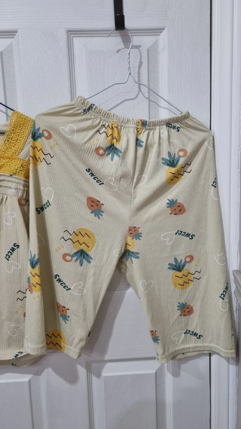 25Pajama set in size M! The set features a top with a square neckline and matching shorts. The fabric is a light beige colour with a fun pineapple and strawberry pattern. Perfect for a cozy night's sleep!