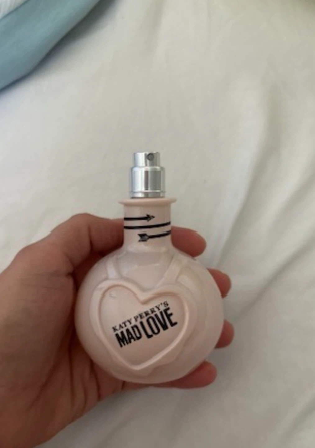 This is Katy Perry's Mad Love Eau de Parfum. It comes in a light pink, round bottle with a silver spray cap. The bottle has decorative arrows on the neck.