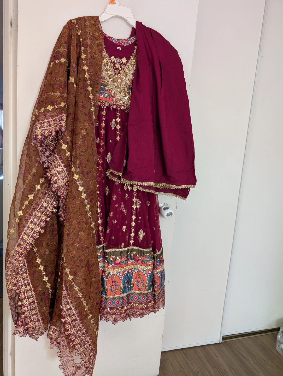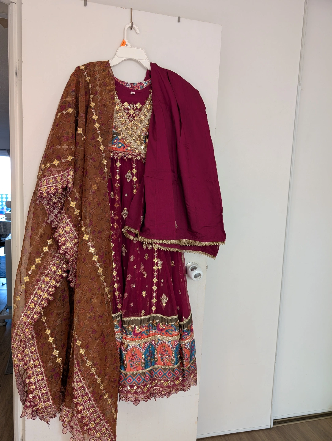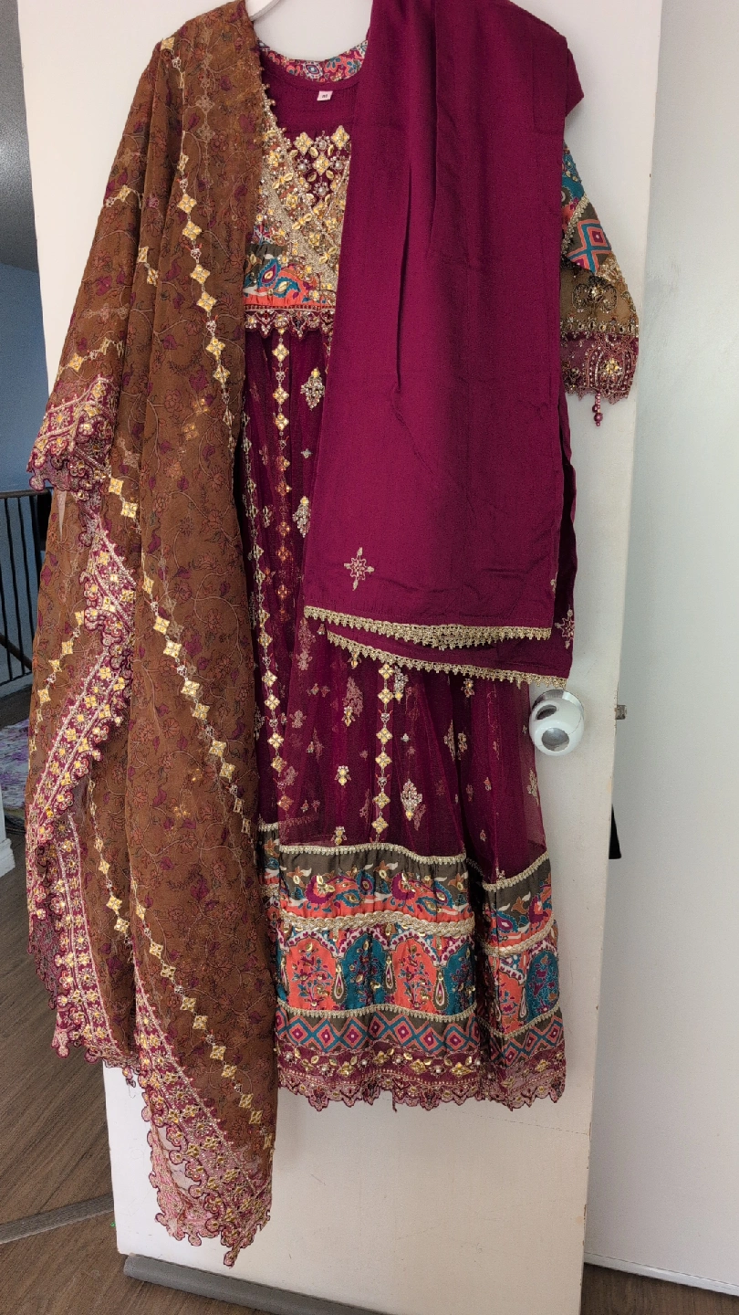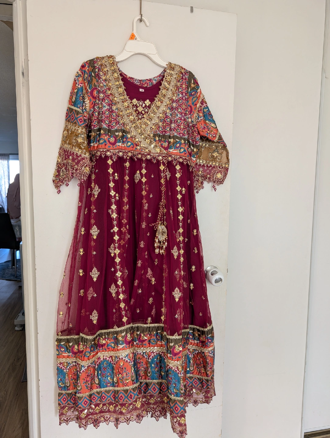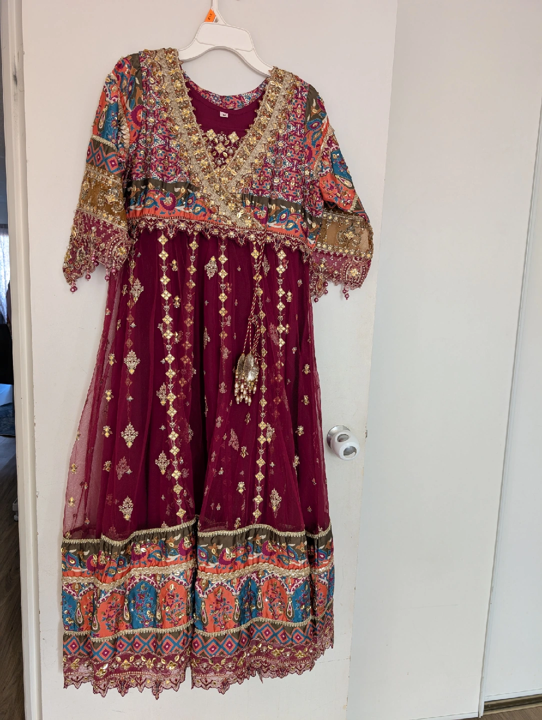 Beautiful Pakistani or Indian dress in burgundy and gold. Includes the dress, pants, and shawl. The dress has intricate detailing and is perfect for a special occasion!