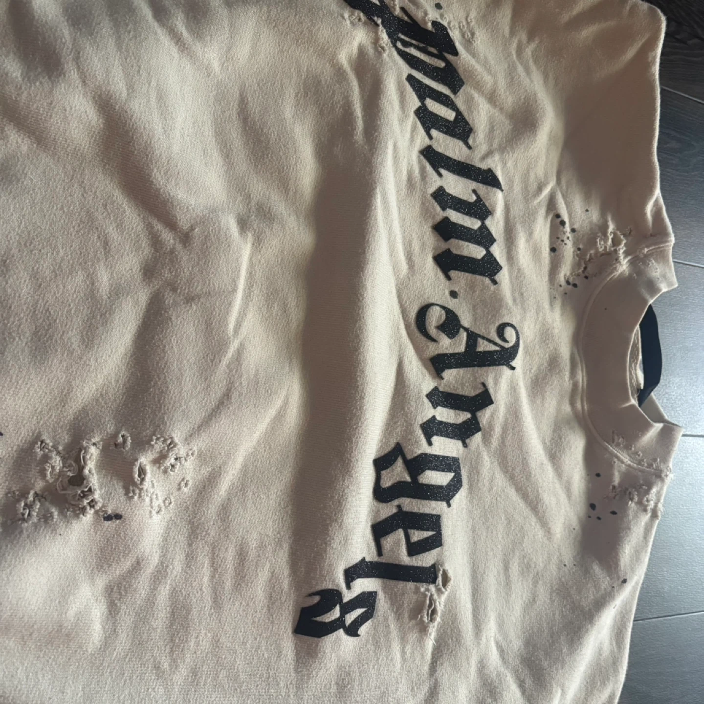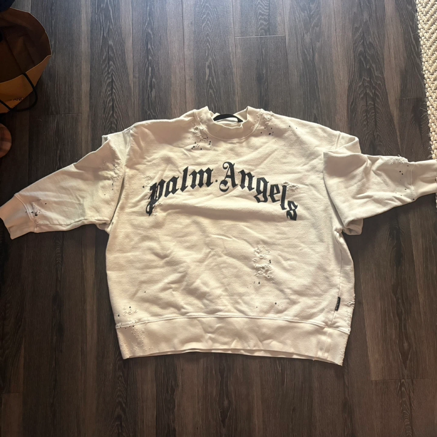 23Selling a Palm Angels crewneck in size XL. It has a distressed look with intentional rips and tears throughout the design. The material is 100% cotton. retail: 1000$