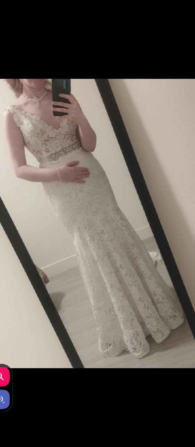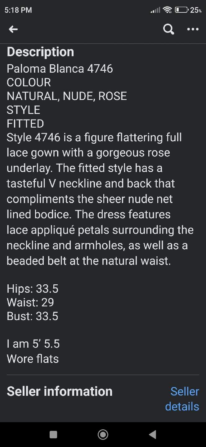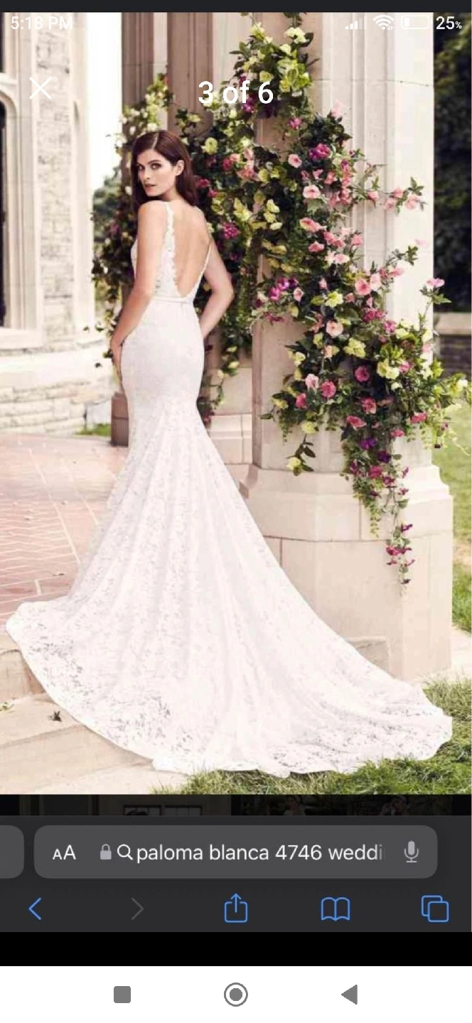 Selling a beautiful Paloma Blanca 4746 wedding gown. The colour is a lovely natural nude/rose. It's a fitted style with a figure-flattering full lace gown and a gorgeous rose underlay. The dress has a tasteful V neckline and back, complemented by a sheer nude net lined bodice. It also features lace appliqué petals surrounding the neckline and armholes, along with a beaded belt at the natural waist. The measurements are: Hips: 33.5, Waist: 29, Bust: 33.5