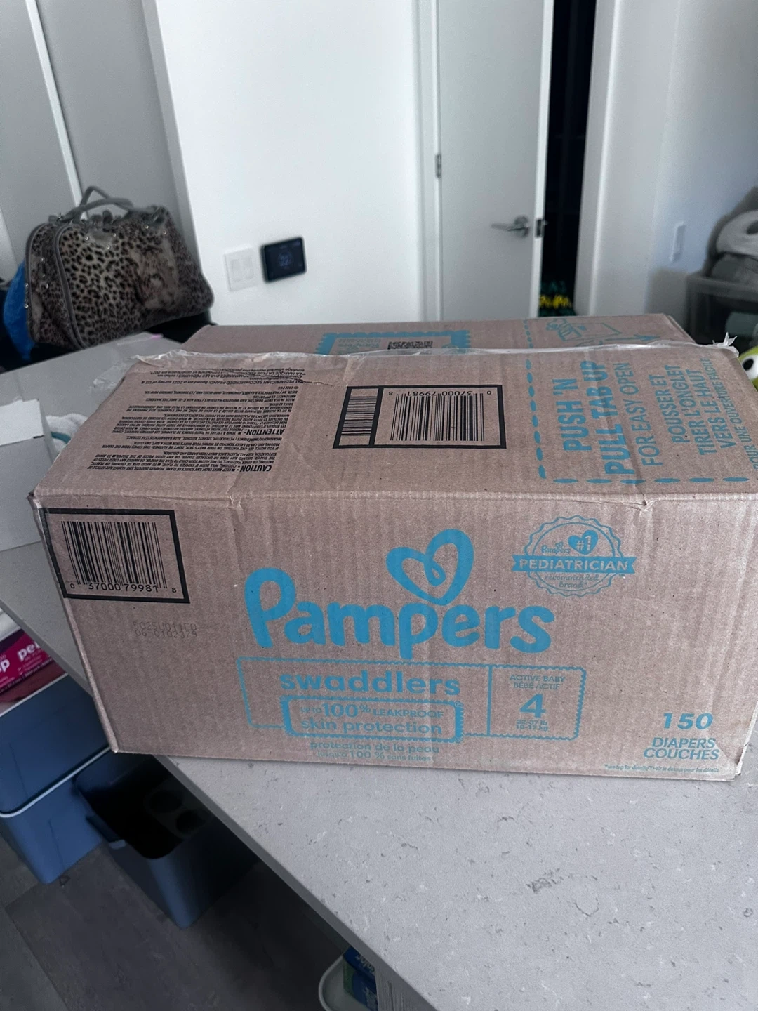 Selling a box of Pampers Swaddlers diapers, size 4. The box contains 150 diapers, perfect for your little one! Not quite sure what age they are for but the size is 4 These diapers offer 100% skin protection and are designed for active babies.
