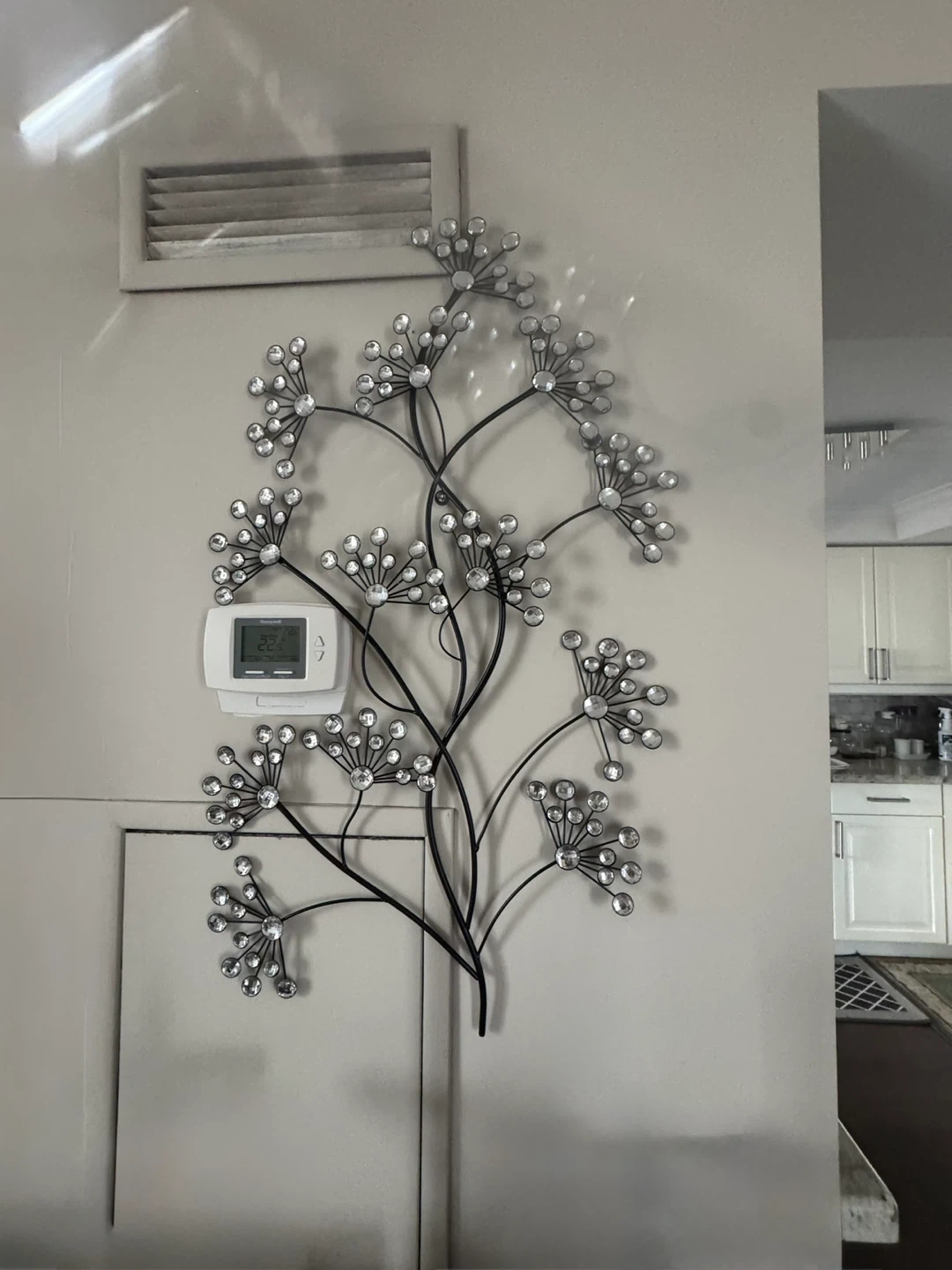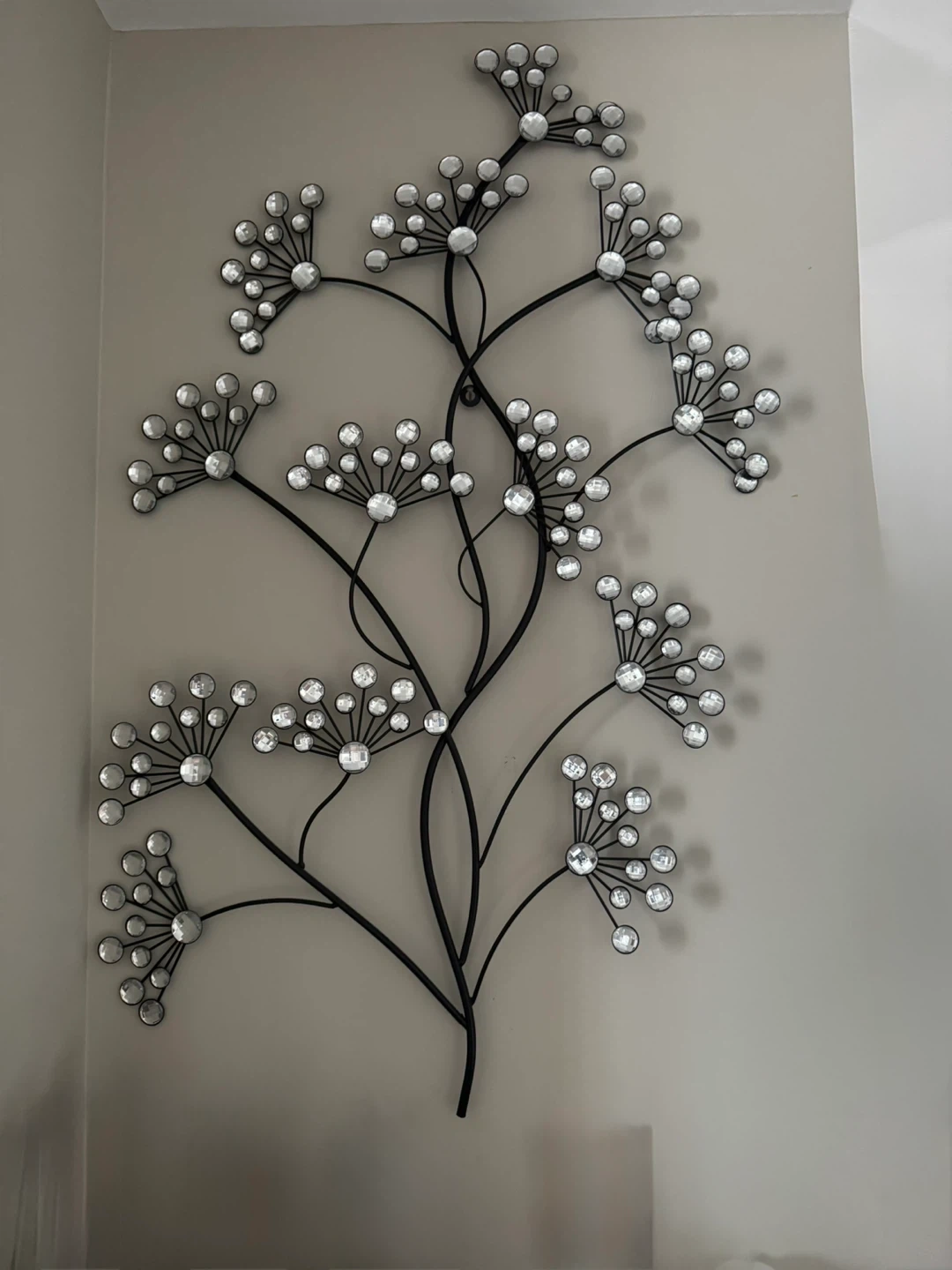 Decorative metal wall art with a floral branch design. Accented with clear crystal-like elements. Dimensions: 35” tall and 20” wide. $100 for both.