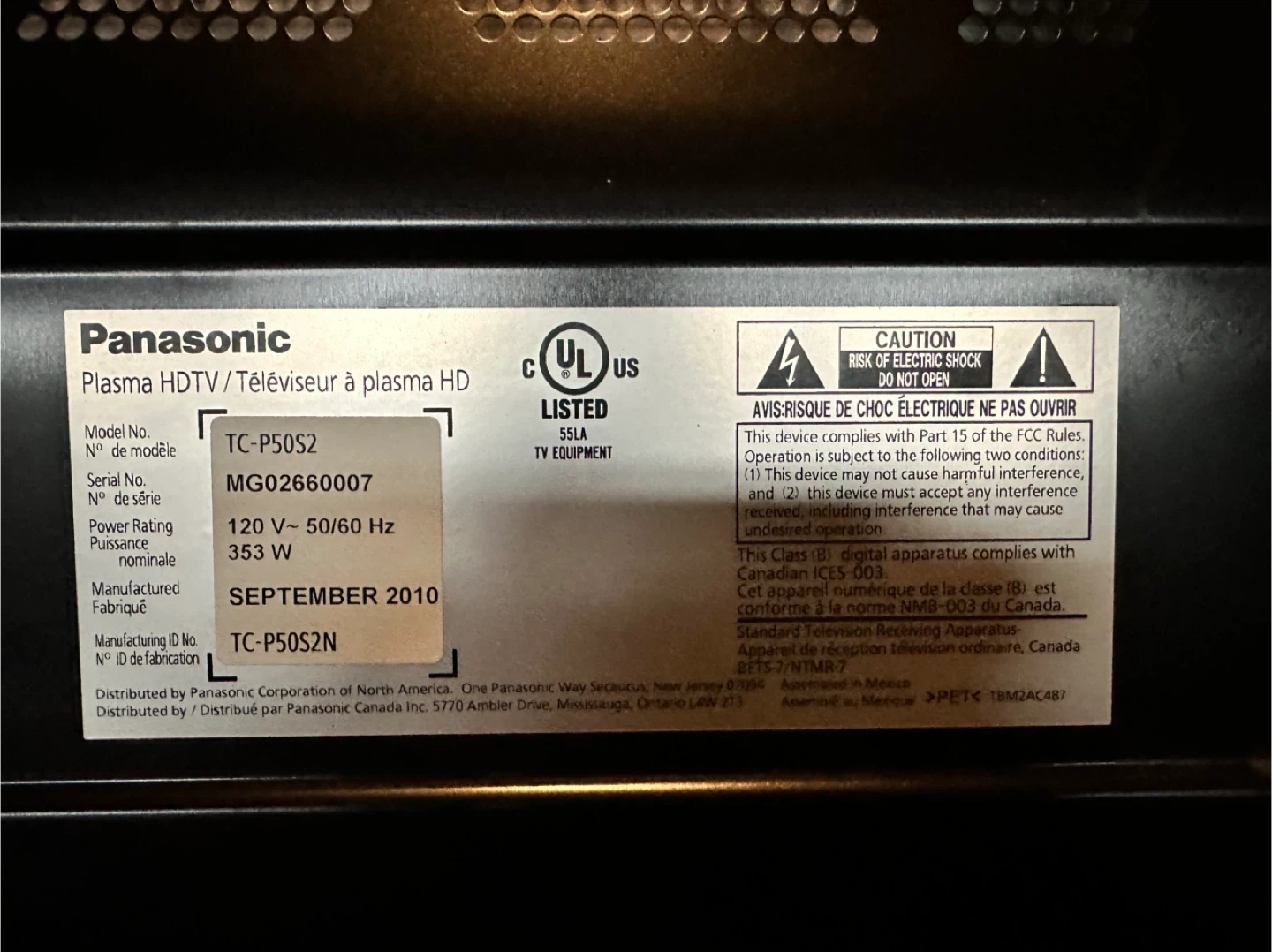 60Selling a Panasonic Plasma HDTV, model TC-P50S2. It's a 51-inch TV manufactured in September 2010. Comes with a TV wall mount. Great for a basement or rec room! Does not have the original TV stand. The TV includes a wall mount. It is not a smart TV.