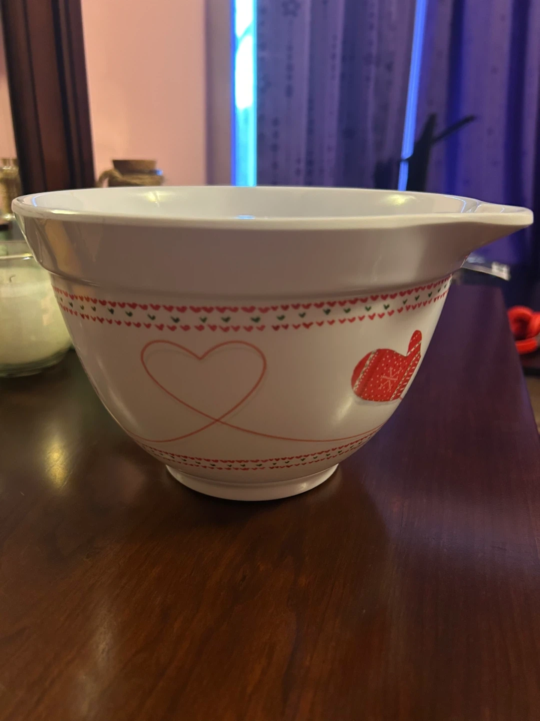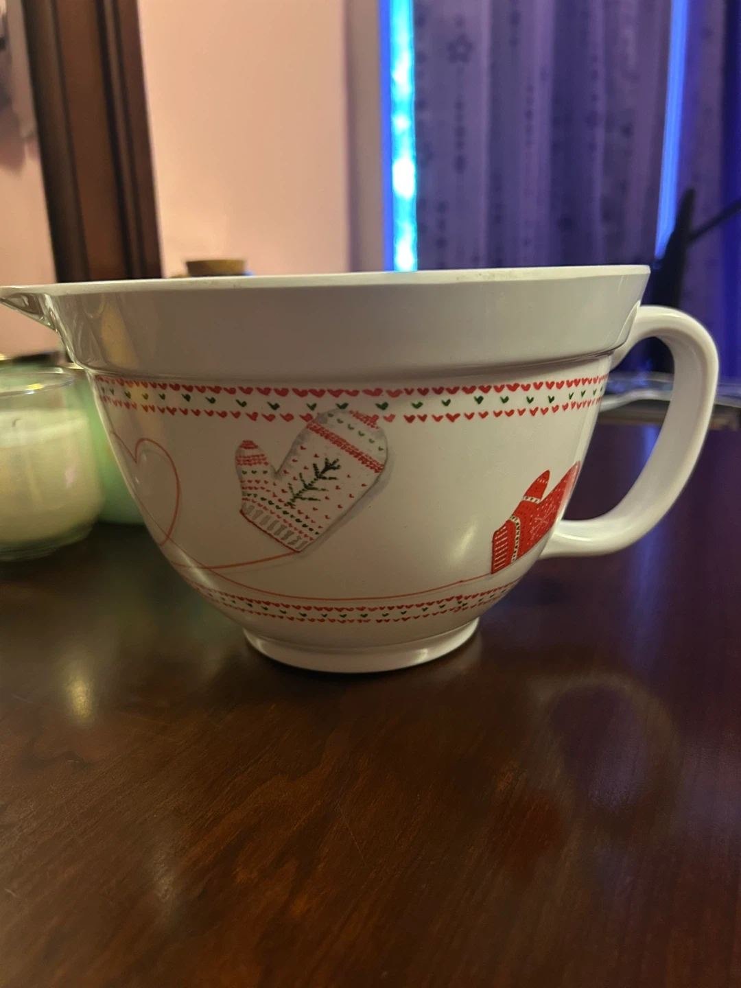 65Cute winter pancake/baking bowl with handle and spout. Used once, good for making cupcakes, cookies, cakes, pancakes, etc