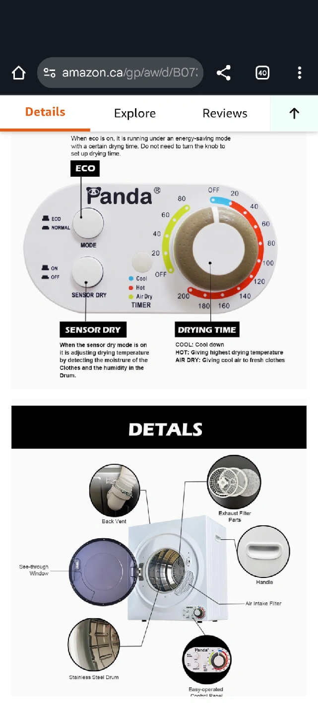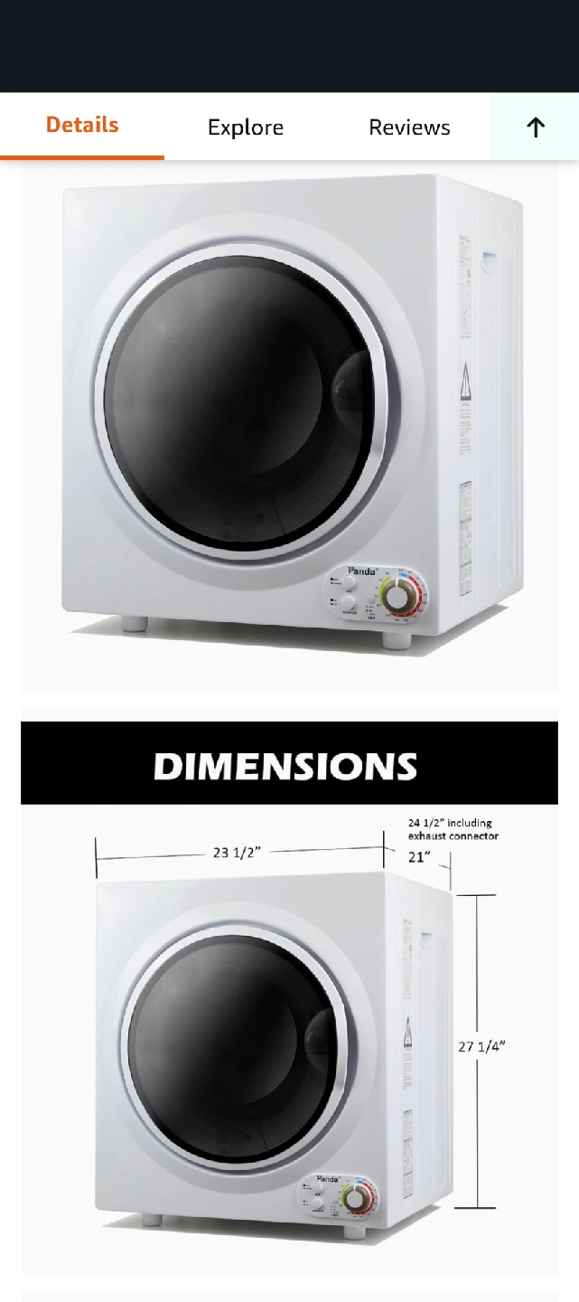60This Panda portable compact laundry dryer is perfect for small spaces! It features: - Stainless steel drum - See-through window - Easy-operated function panel - Back vent - Exhaust filter fans Dimensions: - 23 1/2" wide - 21" deep (23 1/2" including exhaust connector) - 27 1/4" high MUST PICKUP , NO DELIVERY interact ONLY