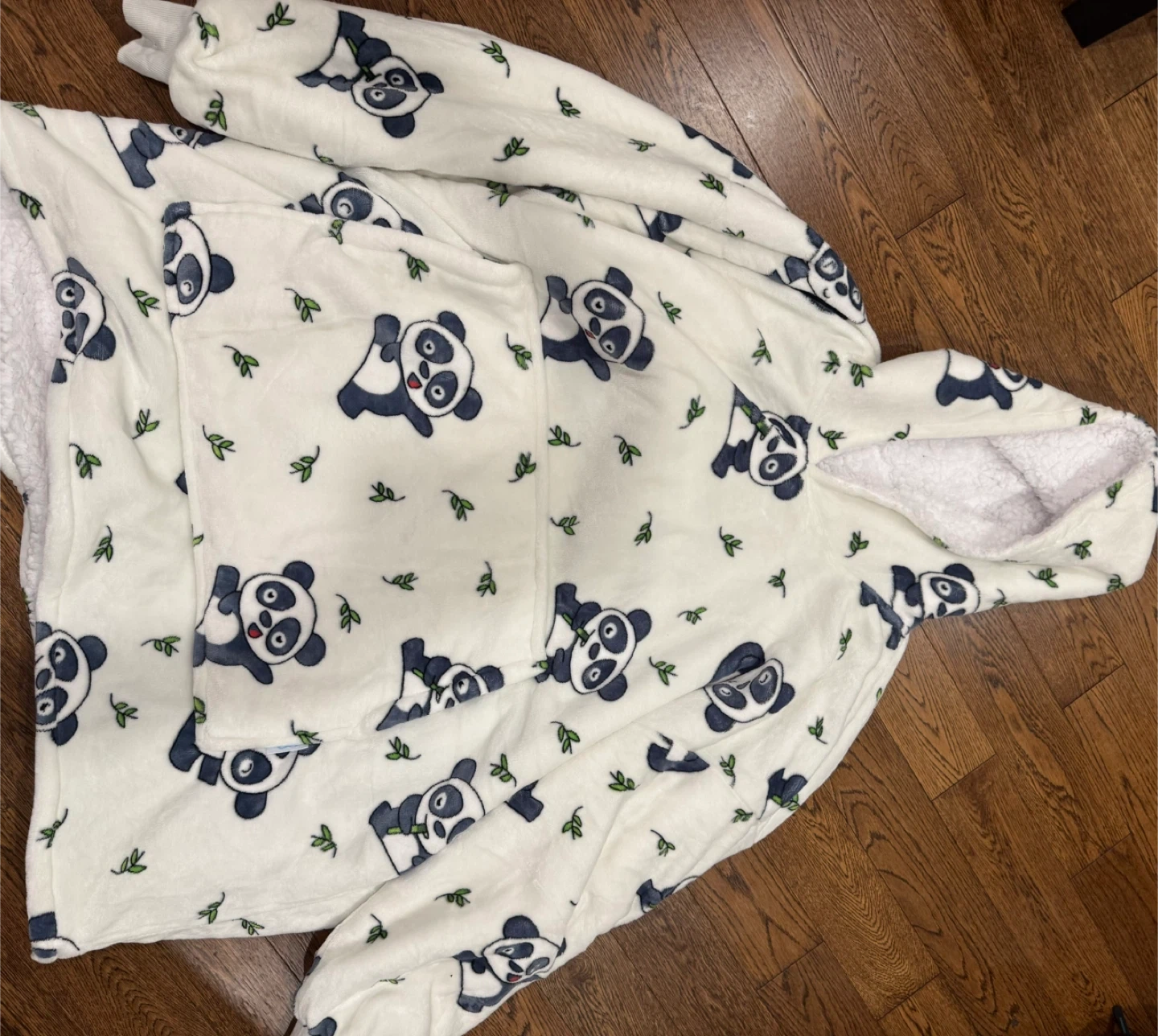 0Cozy up with this super soft wearable blanket hoodie! It features a cute panda print and a sherpa-lined hood to keep you warm and snug. Perfect for lounging around the house on chilly days