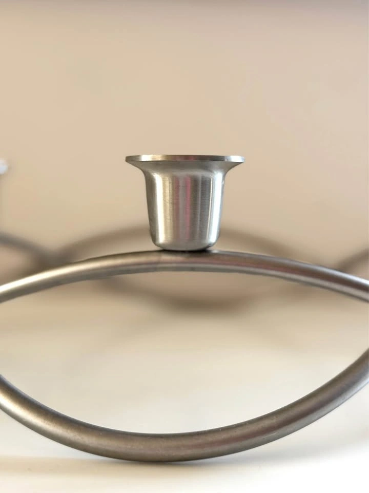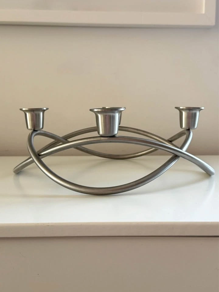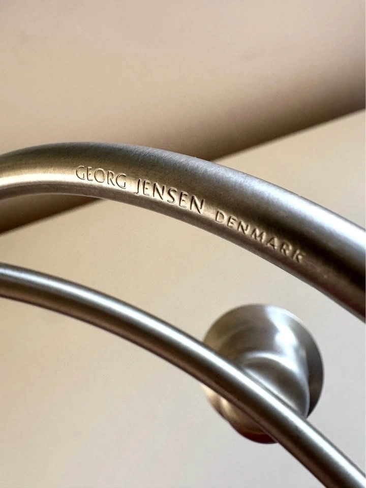 Features an elegant, interlocking infinity-loop silhouette. Stamped "Georg Jensen Denmark". This piece is a staple of Scandinavian minimalism and makes a sophisticated statement on any dining table or mantle.