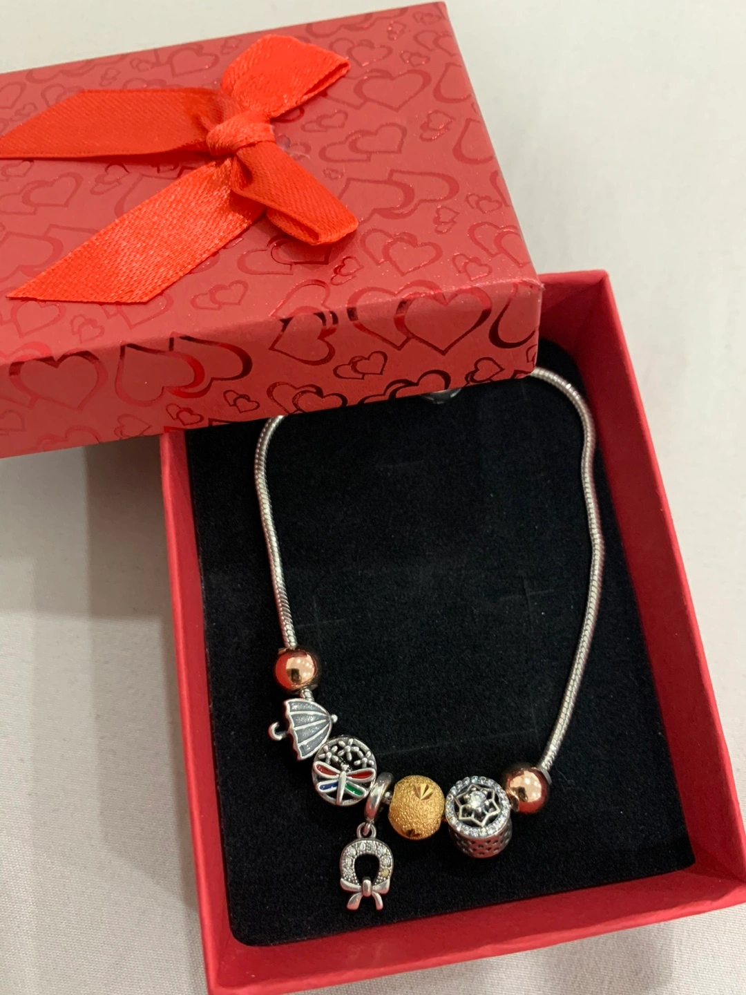 15Silver pandora chain bracelet. Multiple charms included. Comes in a gift box. Looks great Pure silver jewellery certified 92crt