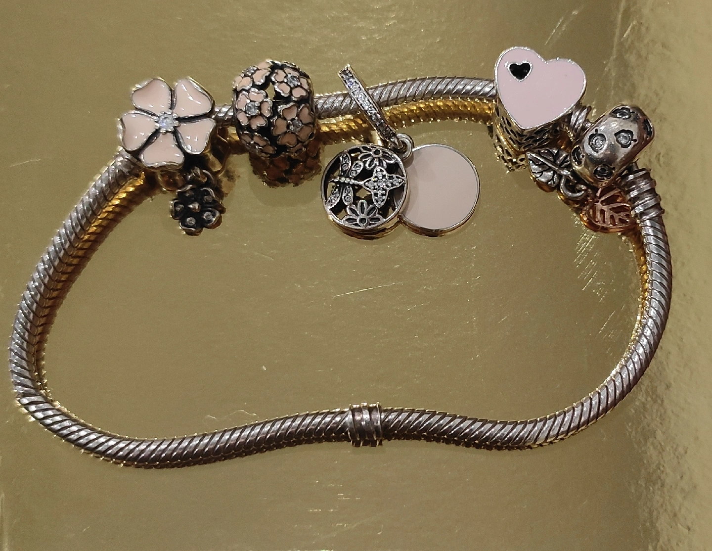 Selling a beautiful Pandora bracelet with several charms. It features a mix of floral, heart, and other decorative charms. The bracelet itself is a silver-tone snake chain style.