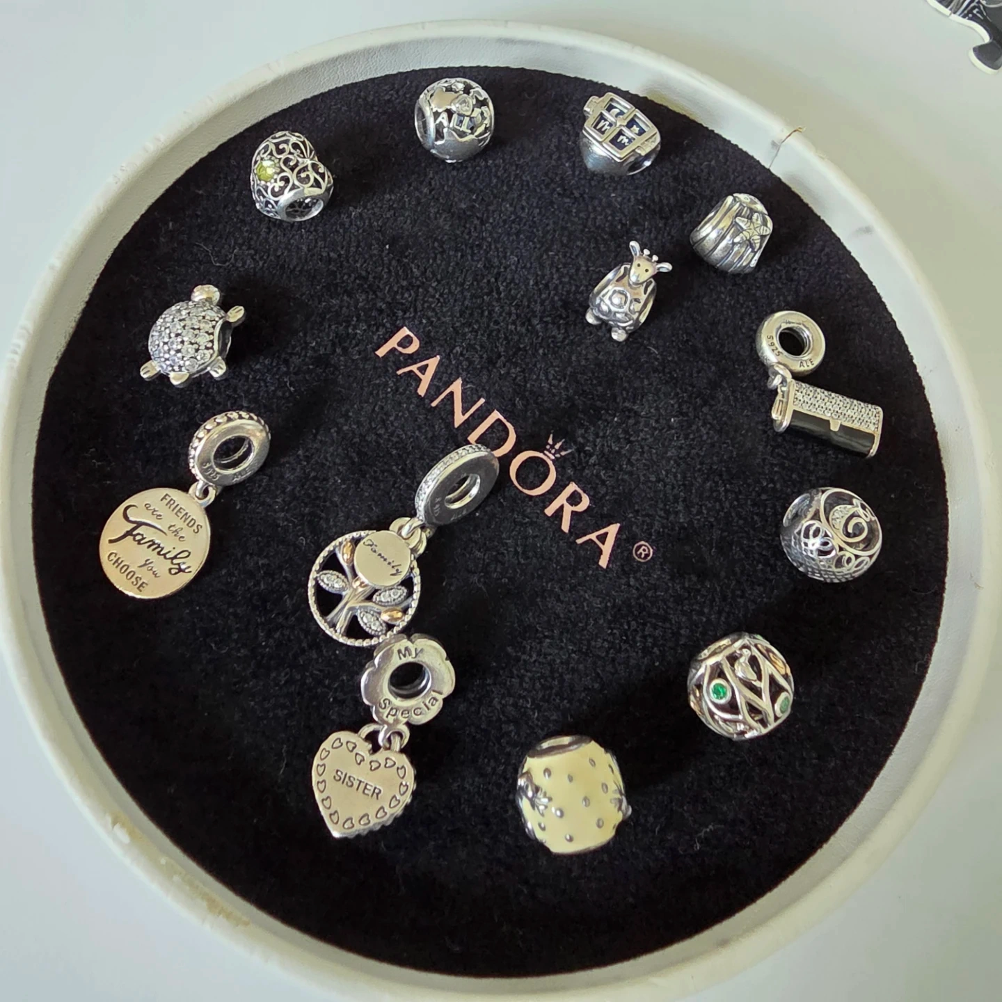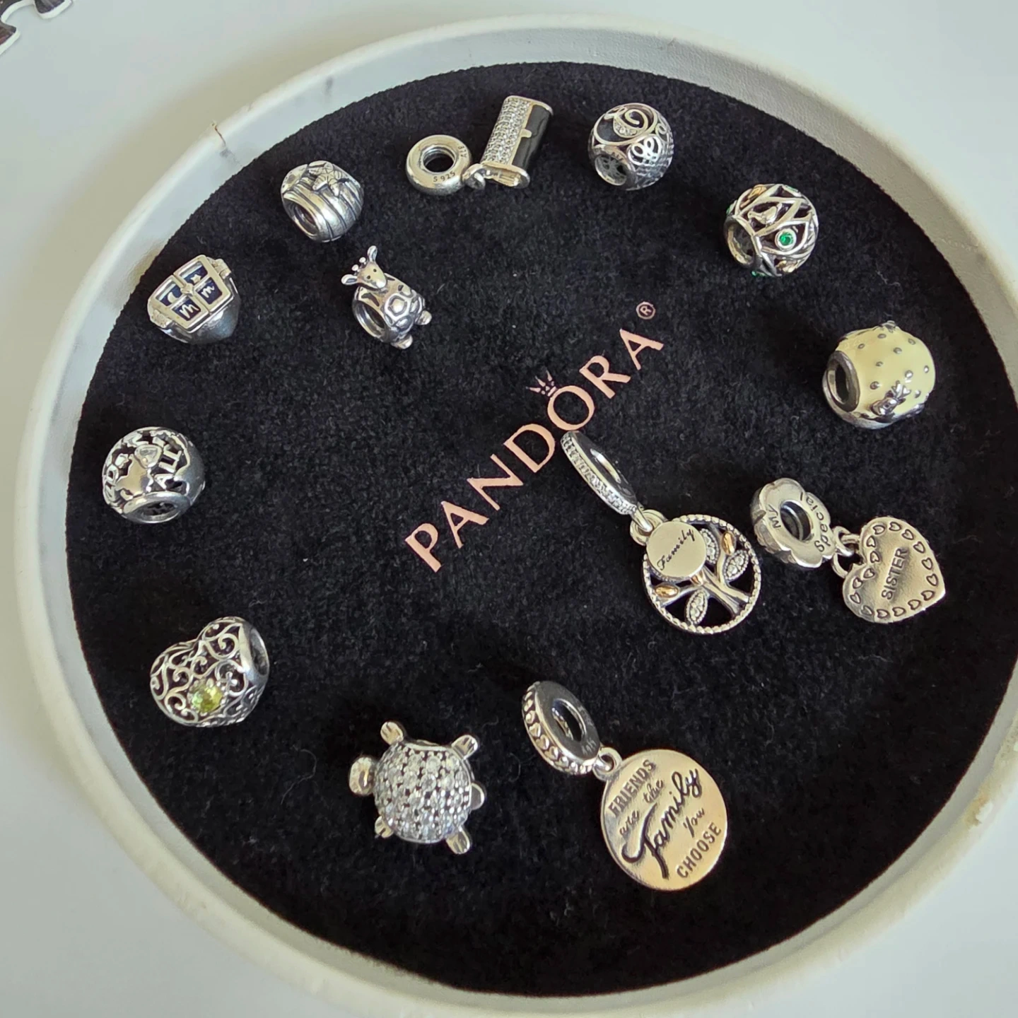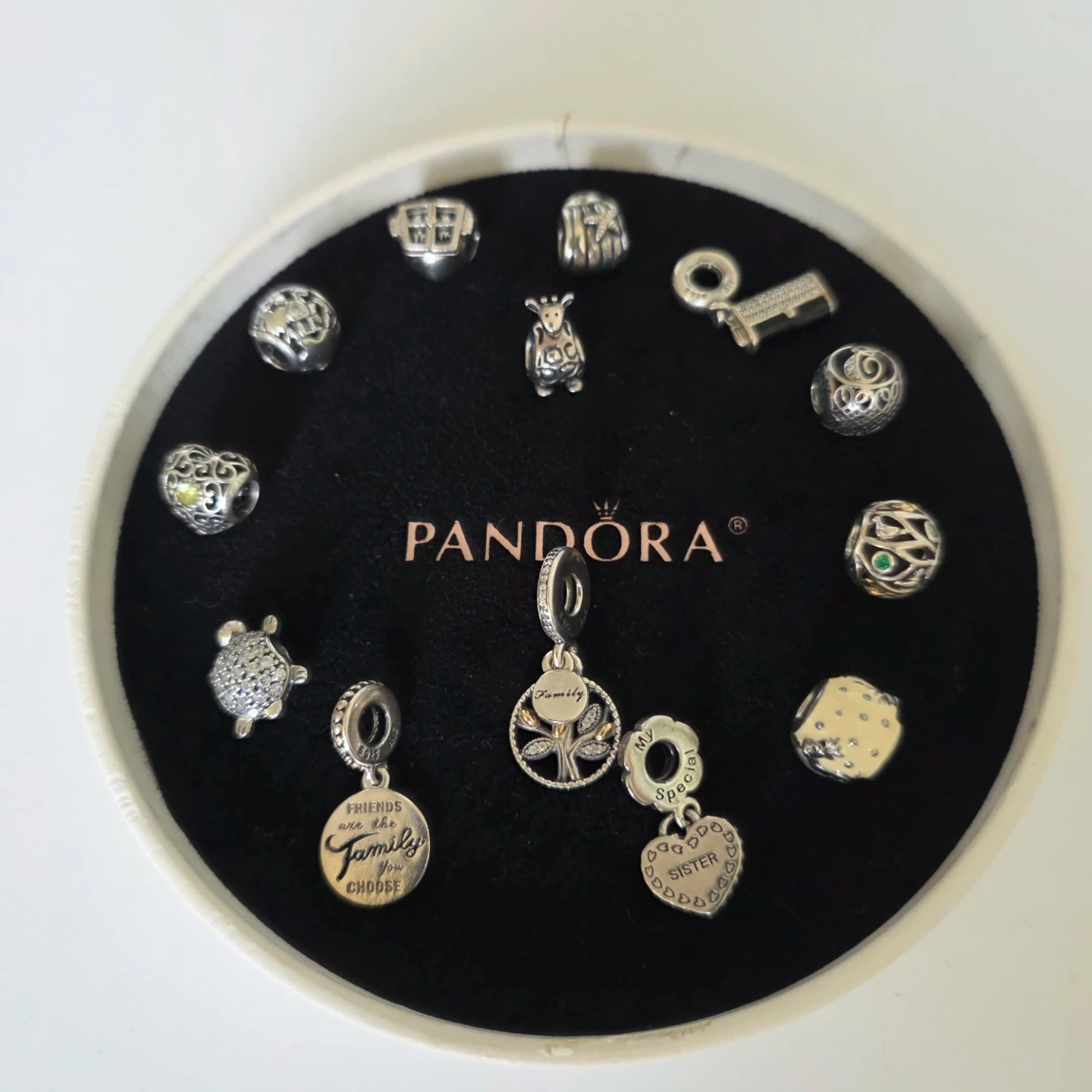 Selling a collection of Authentic Pandora Jewelry There are several different styles available, perfect for adding to your bracelet or necklace. All in great condition! Pave Sea Turtle Charm with Cubic Zirconia stones - $50 Giraffe Animal Bead Charm Retired - $50 Heart-Shaped Peridot Charm - $40 Around the World Charm set with heart-shaped Cubic Zirconia - $40 Thanks For Looking Out For Me open window Charm - $40 Seashell Starfish Charm - $30 Purse Handbag Clutch Charm - $40 Initial Letter E Bead Charm - $40 Birds of a Feather Bead Charm with Emerald Green Zirconia and 14K Gold - $70 Snow Globe Charm Plated Enamel White with reindeer and the words “Merry Christmas” are engraved on the bottom - $40 Sister Charm *Only one half* - $25 Sparkling Family Tree Dangle Charm 14k Gold, Sterling silver - $70 Jewelry Friends Are Family Dangle Charm - $40