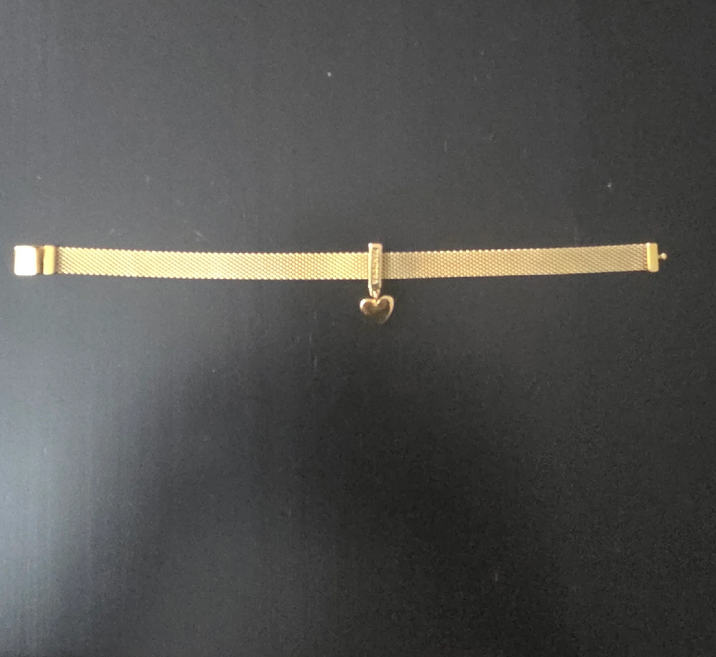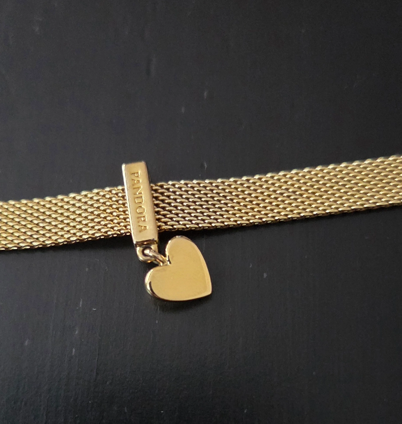 10This is a beautiful gold-plated Pandora mesh bracelet with a heart charm. It's in great condition and would make a lovely addition to any jewelry collection. The bracelet is stylish and perfect for adding a touch of elegance to any outfit. Feel free to message me with any questions!