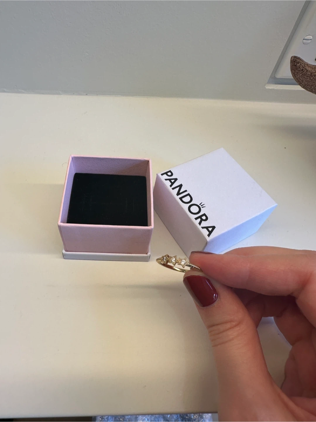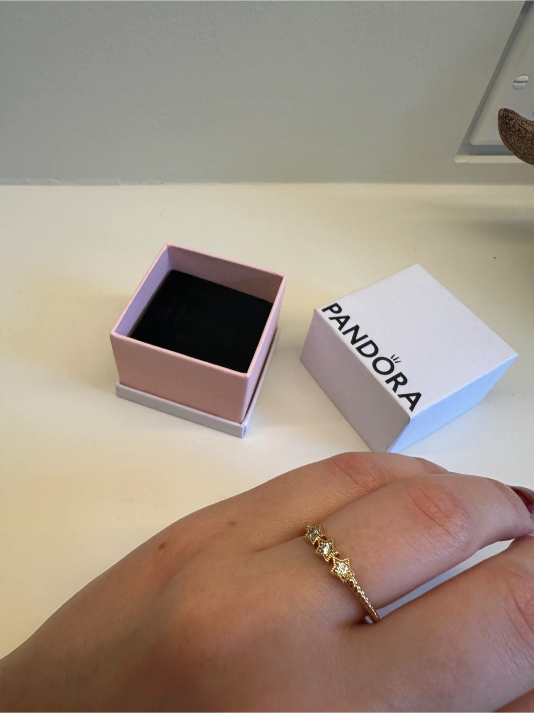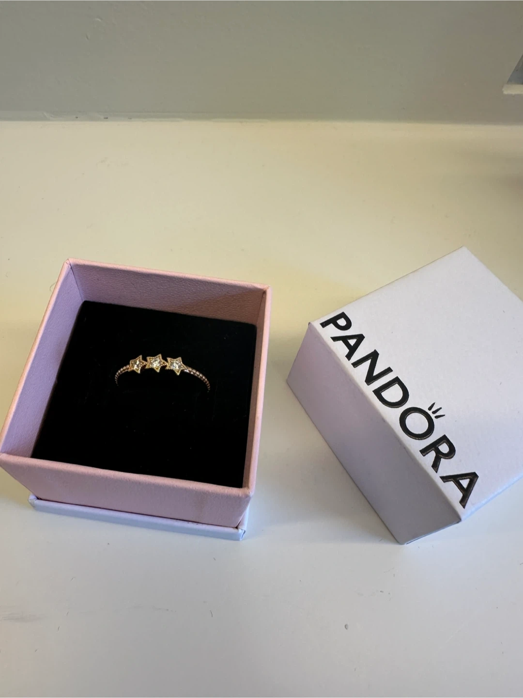 10Selling a lovely Pandora ring! It's a gold-coloured band with three star embellishments. Comes with the original box. Ring size is European 52/ US 6.