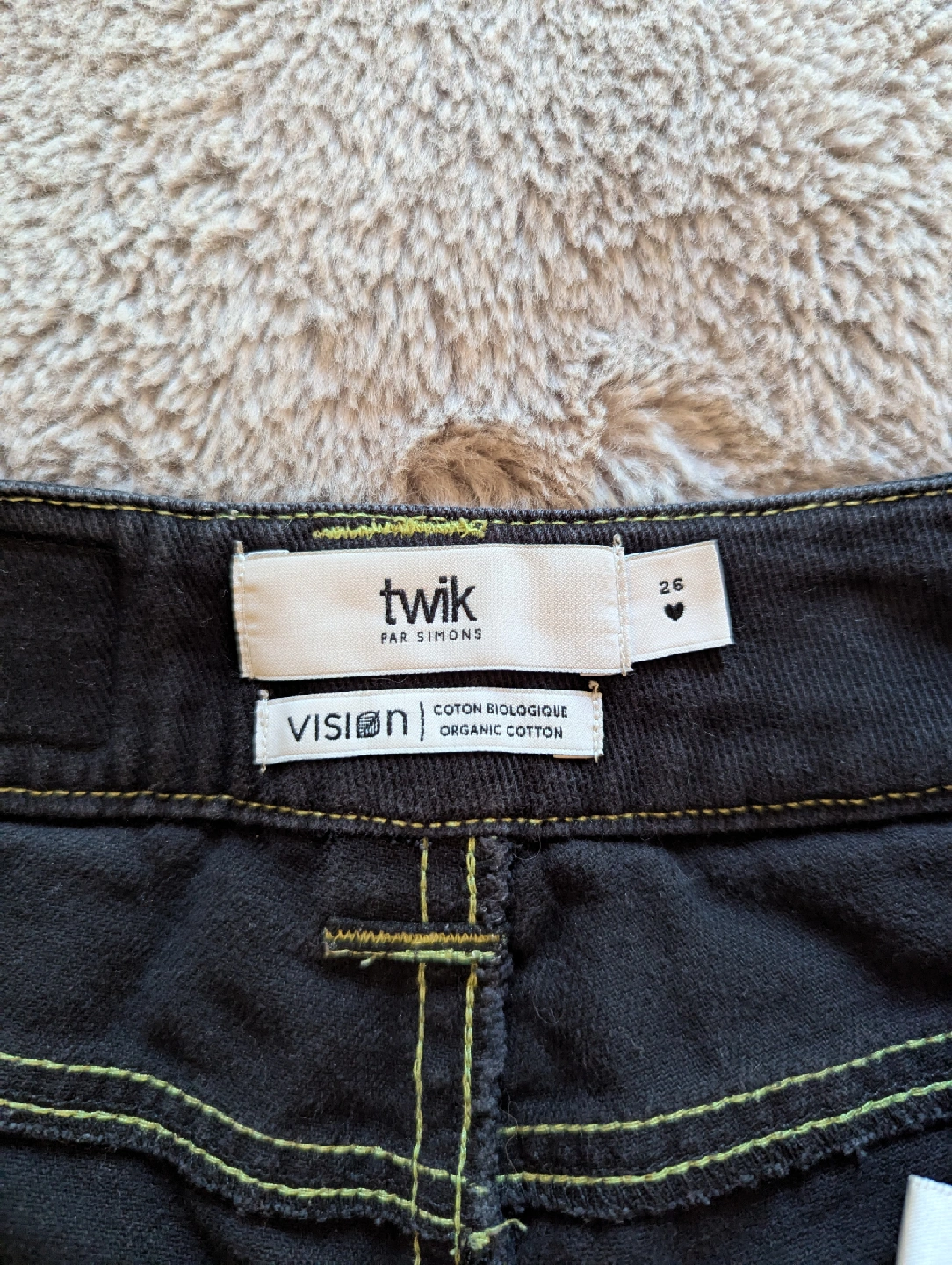 Je vends un pantalon Twik par Simons de taille 26. Il est de couleur noire et fait de coton biologique. Parfait pour un look décontracté et confortable!
