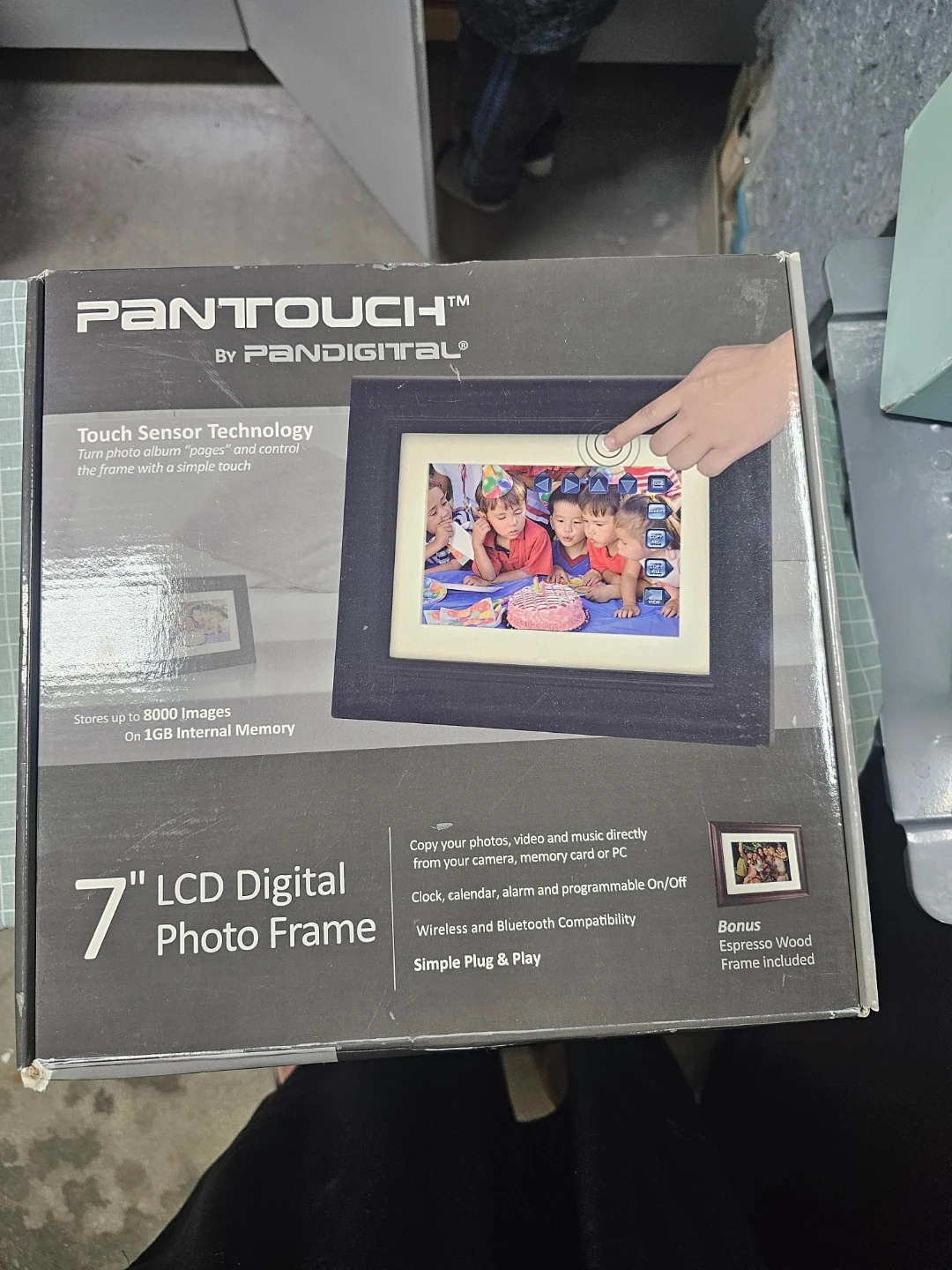 15I'm selling a brand new Pantouch 7" LCD Digital Photo Frame! It's still in its original packaging and has never been used. Key features include: - Touch sensor technology - Stores up to 8000 images on 1GB internal memory - Clock, calendar, alarm, and programmable on/off - Wireless and Bluetooth compatibility - Full function remote control included - Bonus espresso wood frame included!