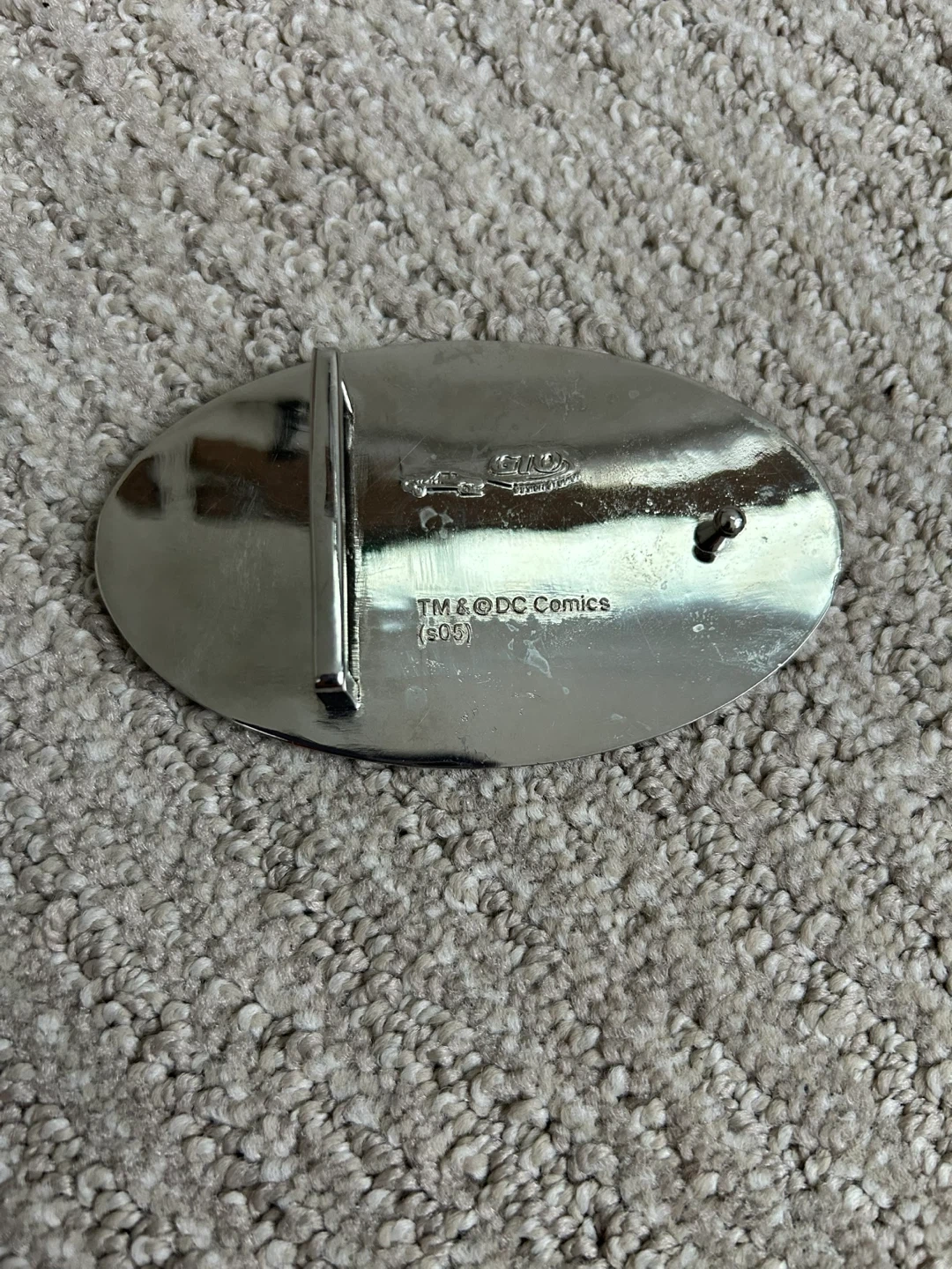 This is a silver-toned belt buckle featuring the classic Batman logo in black and yellow. It's made of metal. A great accessory for any fan!