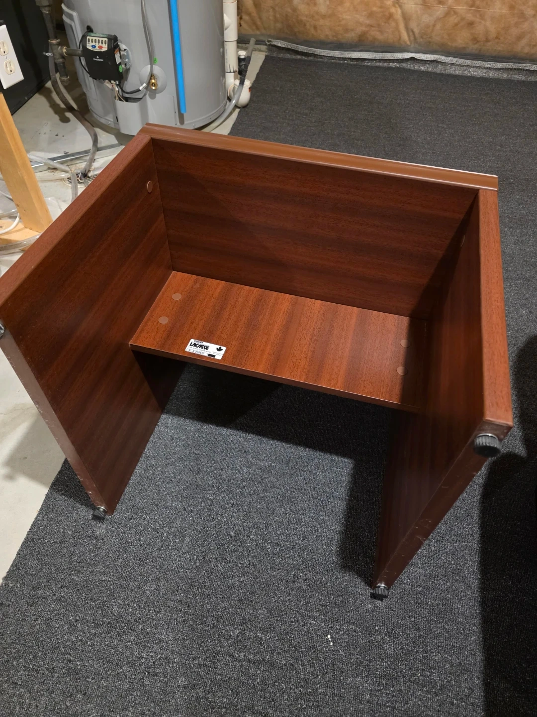 This is a wooden side table from Groupe Lacasse. It's finished in a dark wood grain. It's a sturdy little table that would fit well in a den or living room.