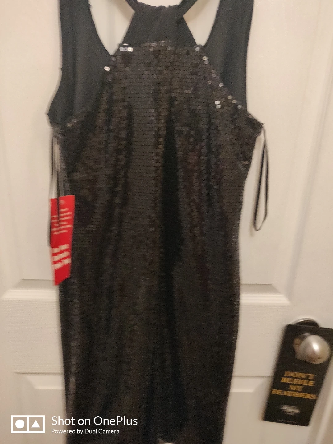 New black sequined dress with crisscross back and adjustable straps on the sides. Here is a little key hole at the top and slit about 4" at the bottom. About knee height. Fits 6/8 size women
