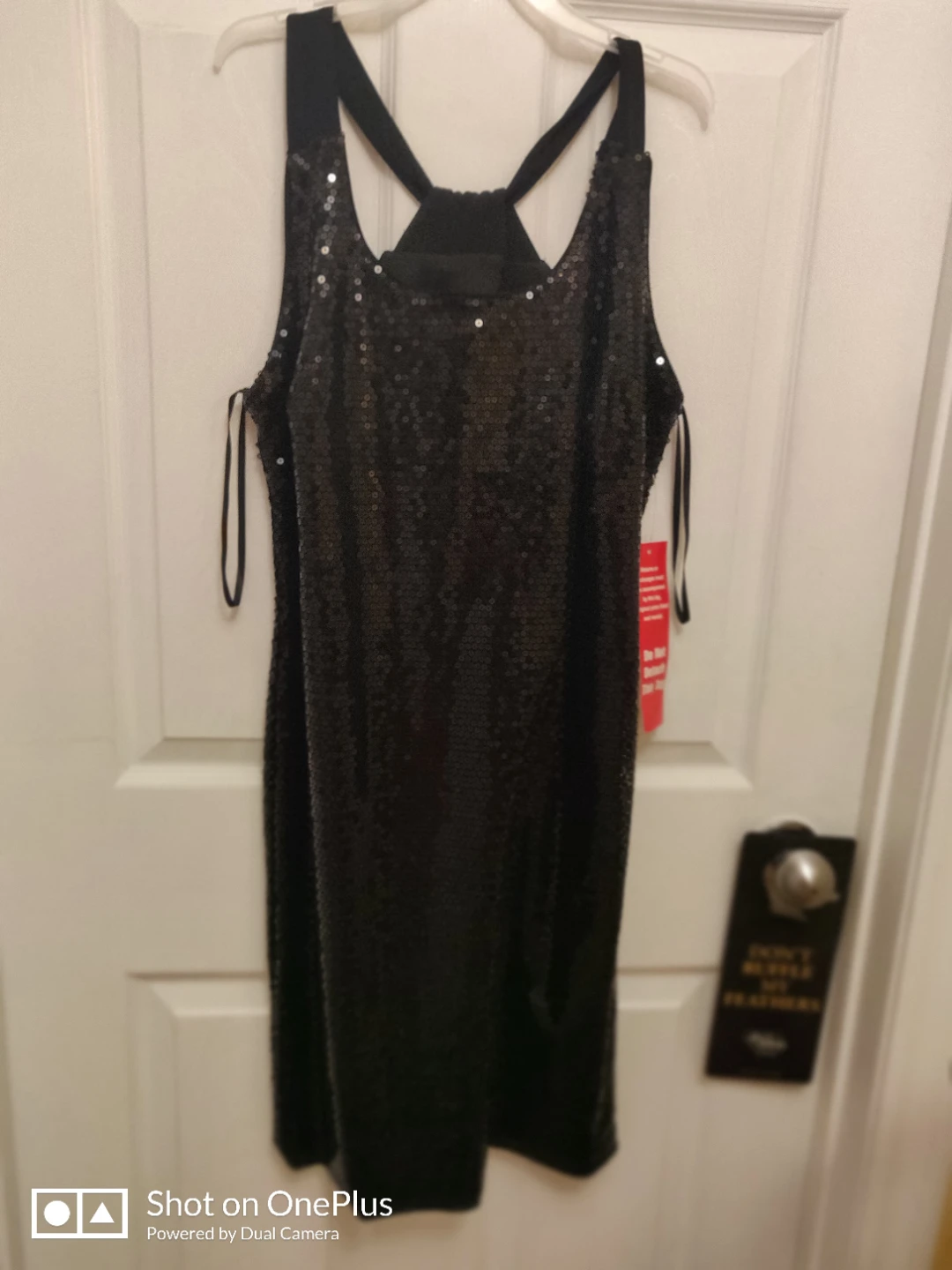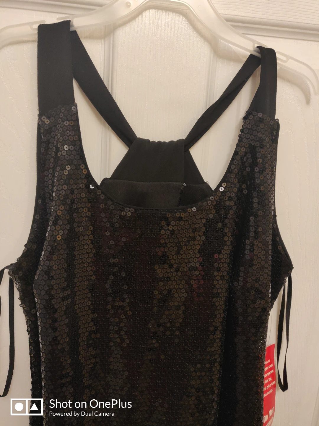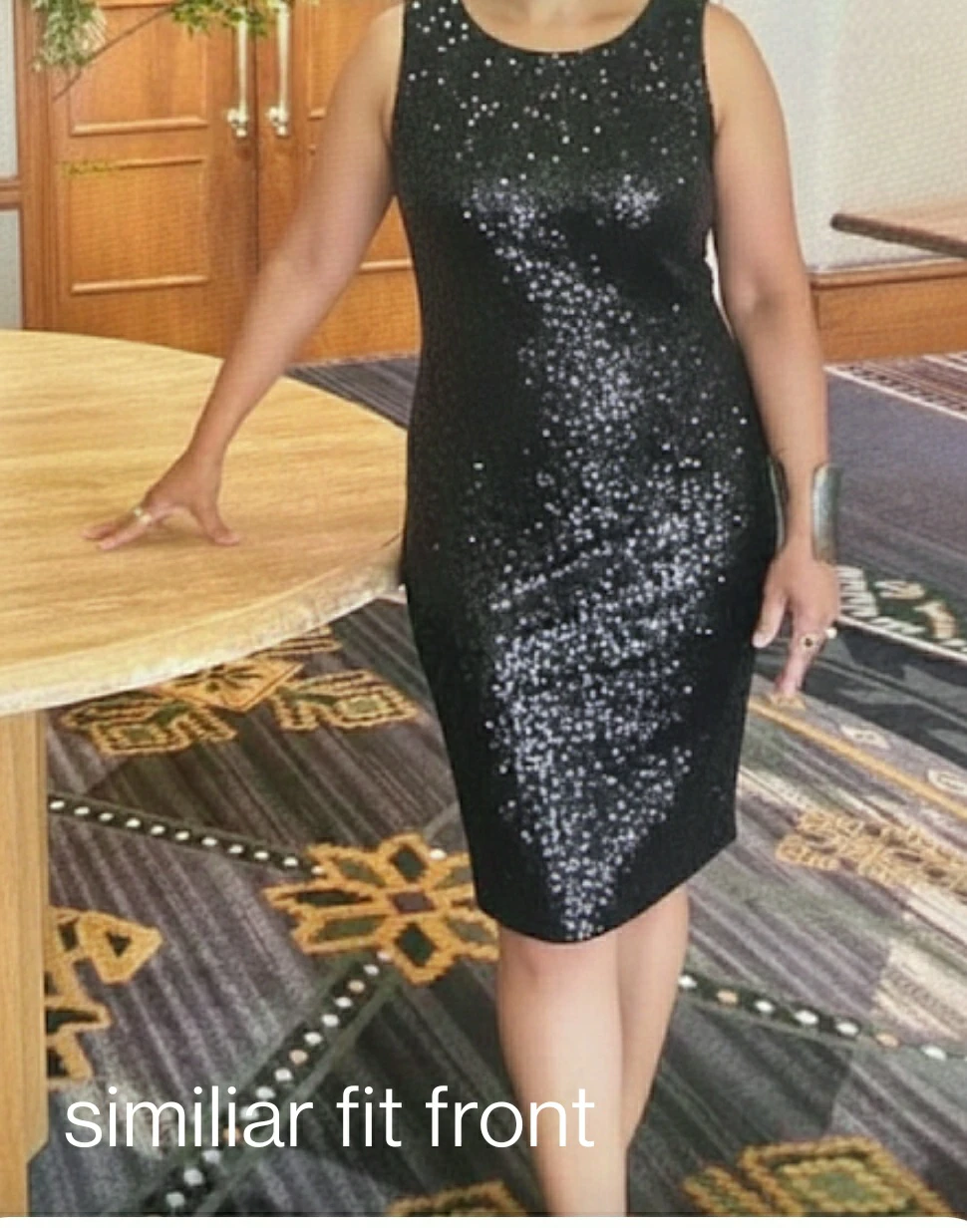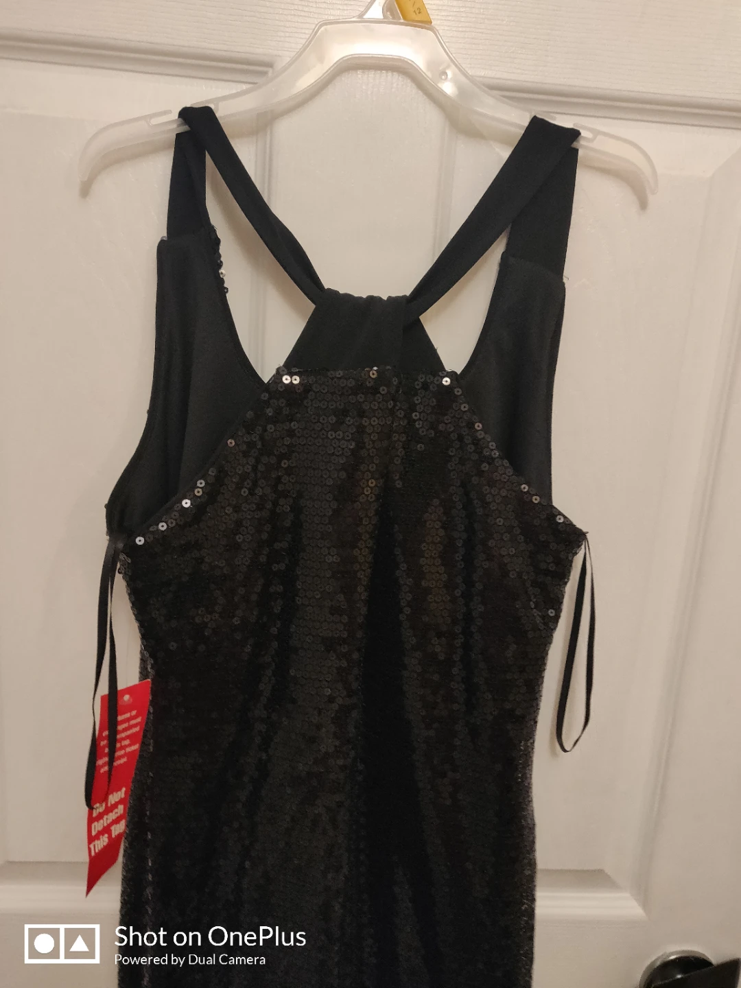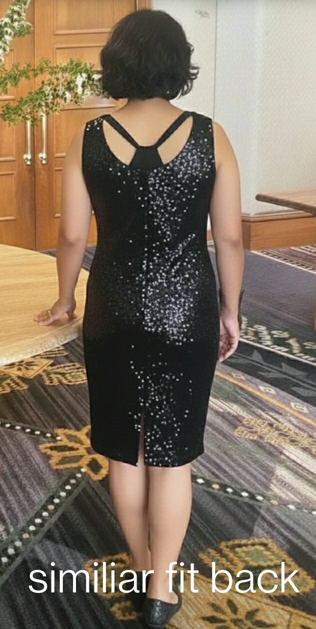 New black sequined dress with crisscross back and adjustable straps on the sides. Here is a little key hole at the top and slit about 4" at the bottom. About knee height. Fits 6/8 size women