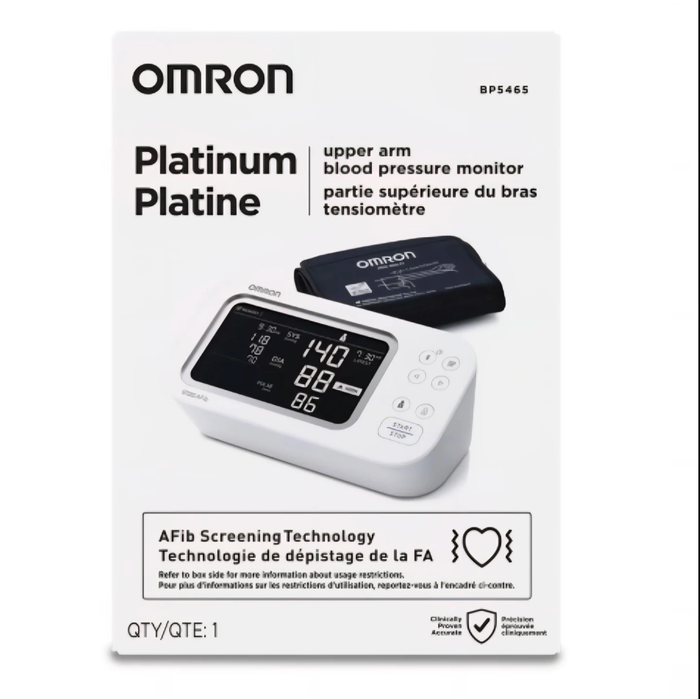 This Omron Platinum Upper Arm Blood Pressure Monitor is designed for easy and accurate readings. It features AFib Screening Technology and a high-contrast, backlit screen for clear visibility. The monitor can store up to 200 readings for two users. It includes the cuff and the main unit. Fits arms 9"-17" [22cm-42cm] in circumference.