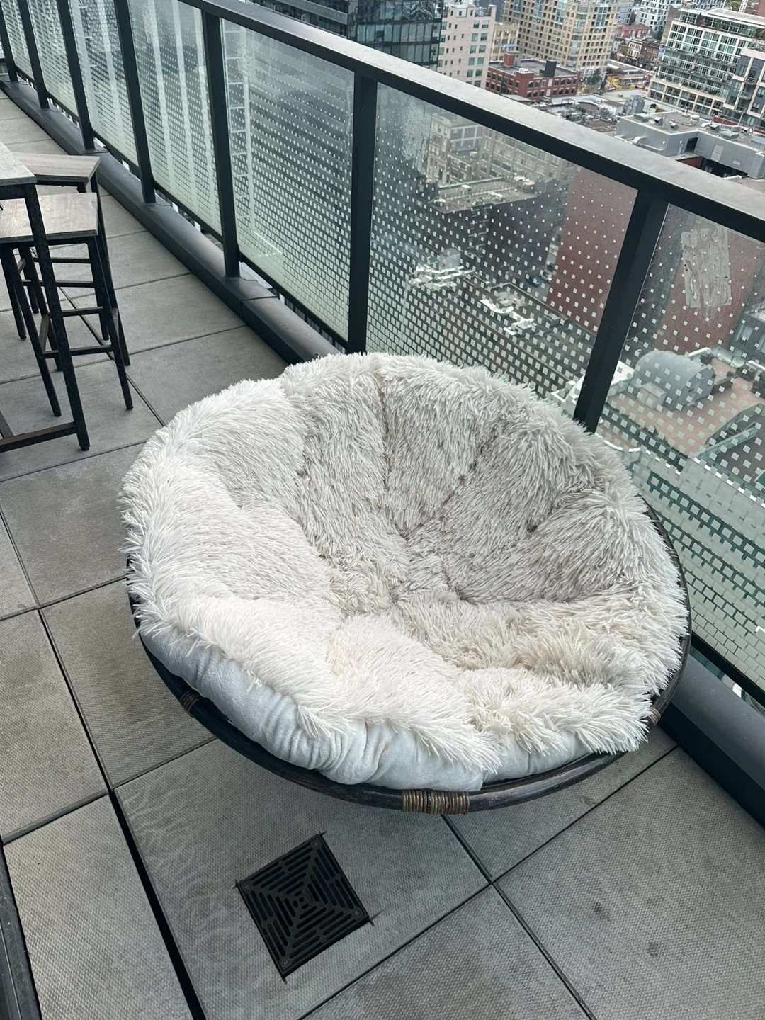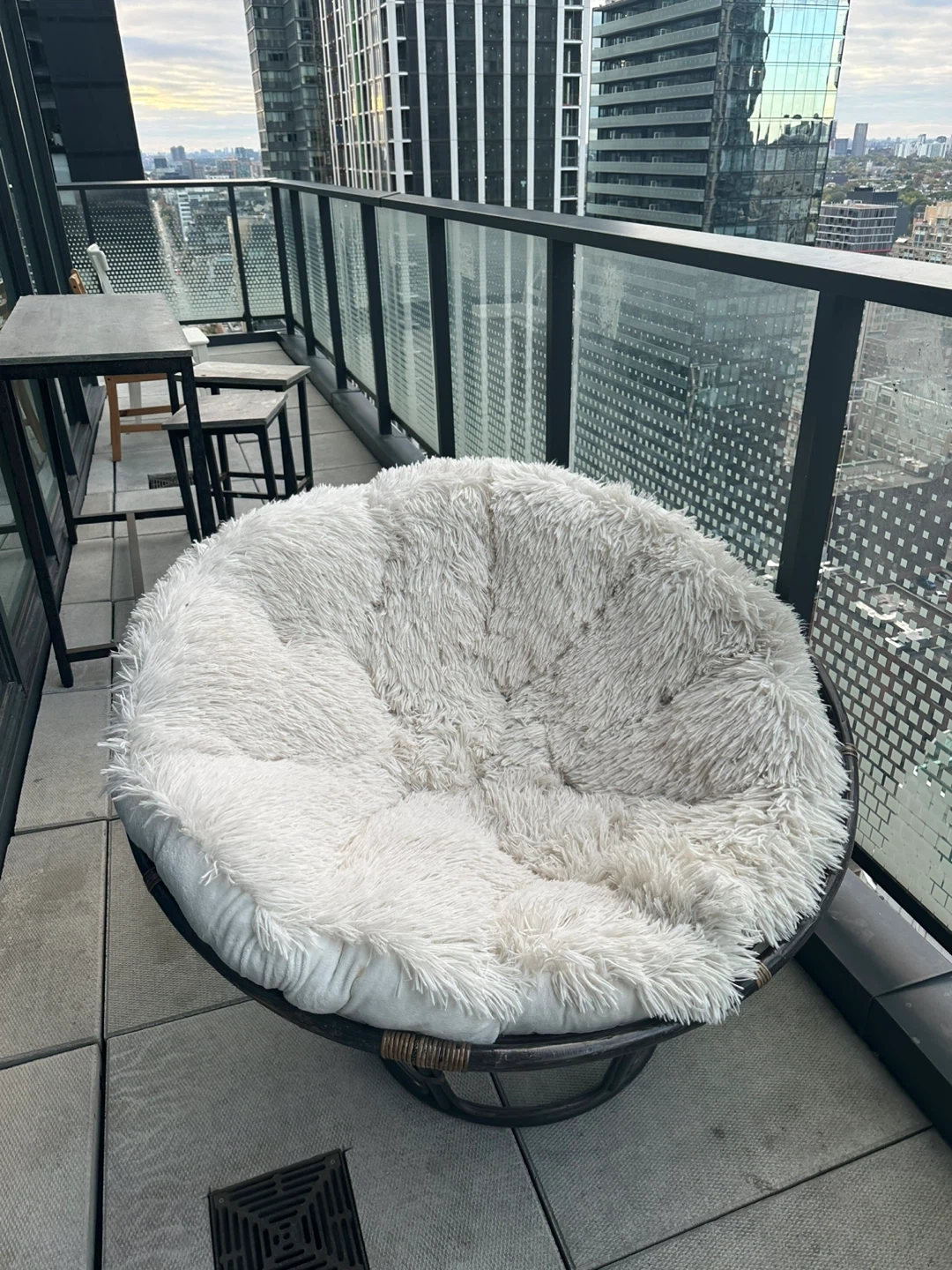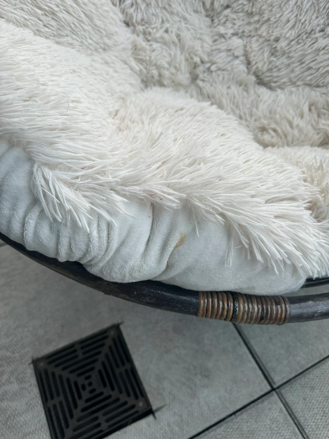Selling a comfy papasan chair that's perfect for relaxing! The cushion is super soft and fluffy, making it a great spot to curl up with a book or just chill out. The frame is sturdy and in good shape. It's a great addition to any living space or balcony. We have been using this outside ! Some dirt but you can wash it.