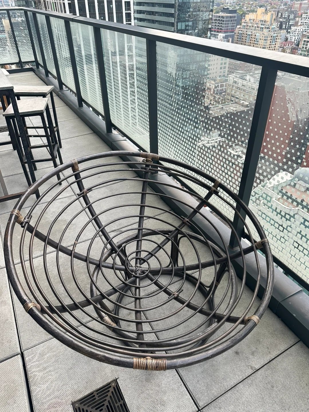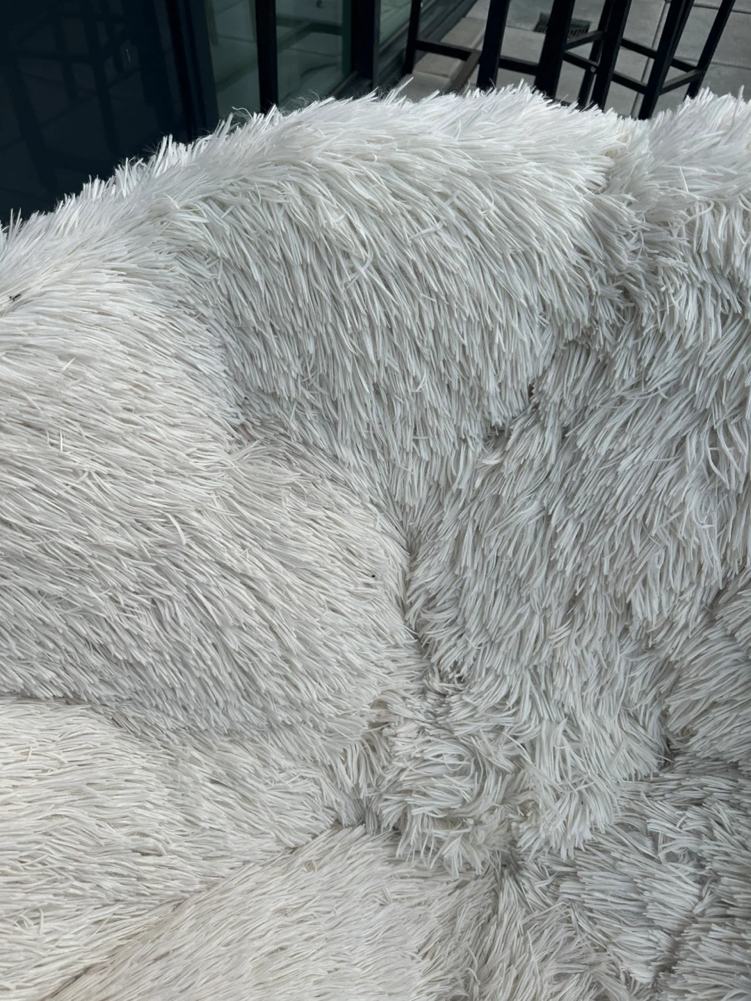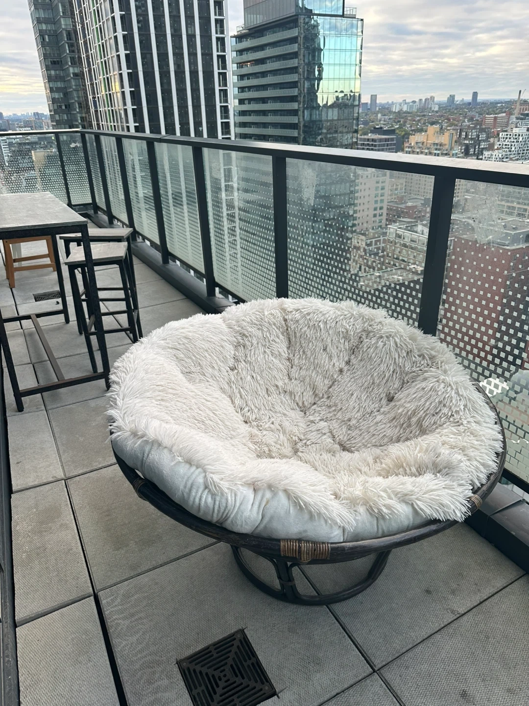 Selling a comfy papasan chair that's perfect for relaxing! The cushion is super soft and fluffy, making it a great spot to curl up with a book or just chill out. The frame is sturdy and in good shape. It's a great addition to any living space or balcony. We have been using this outside ! Some dirt but you can wash it.