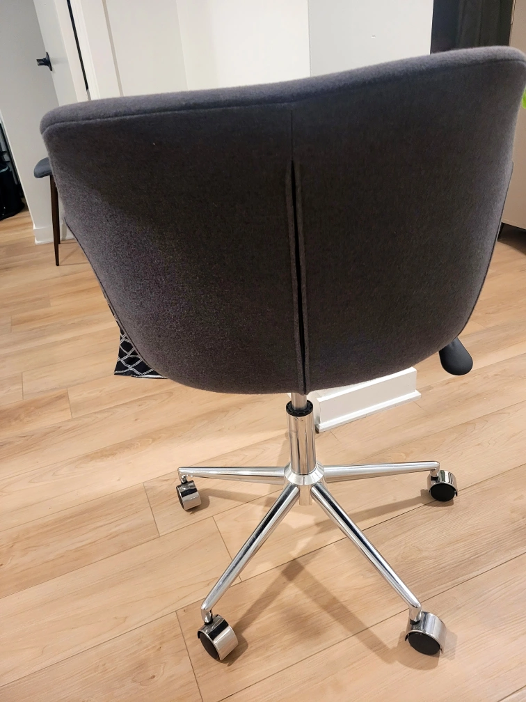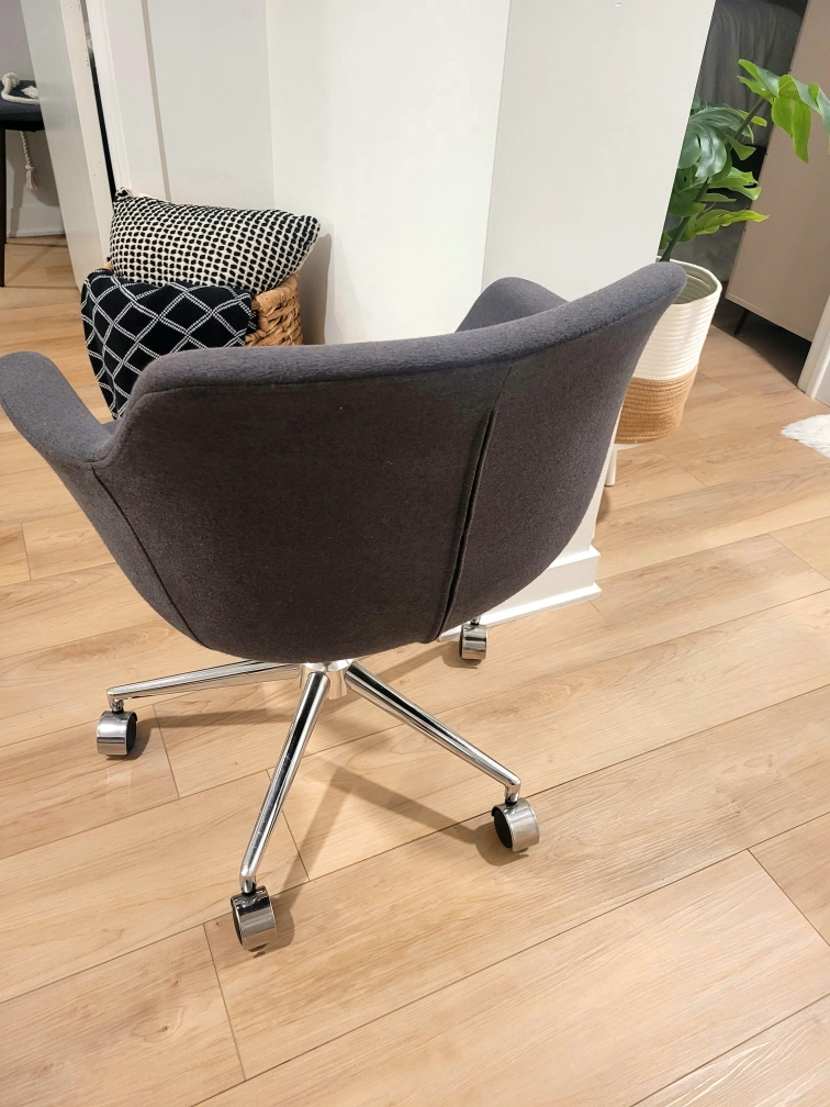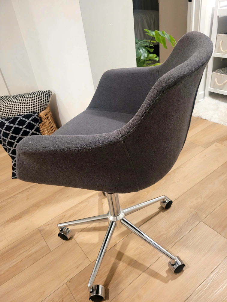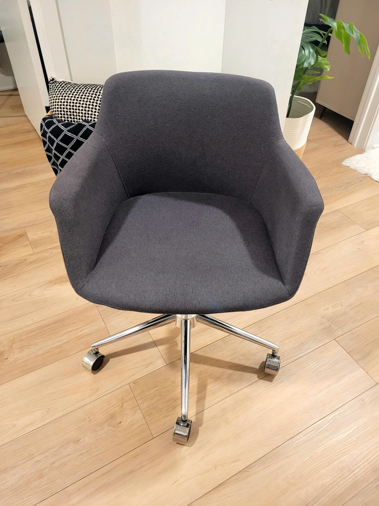 Selling a grey office chair! It's in great shape and ready for a new home office setup. The chair has a sleek design with a sturdy base and smooth-rolling wheels, making it easy to move around your space.