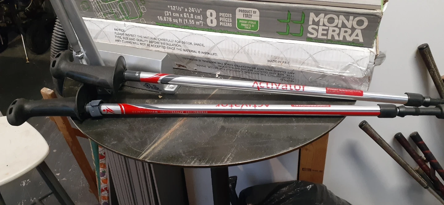 These are Activator Professional trekking poles. They're made of aluminum and have comfortable black grips. They're great for hiking and provide stability on uneven terrain.