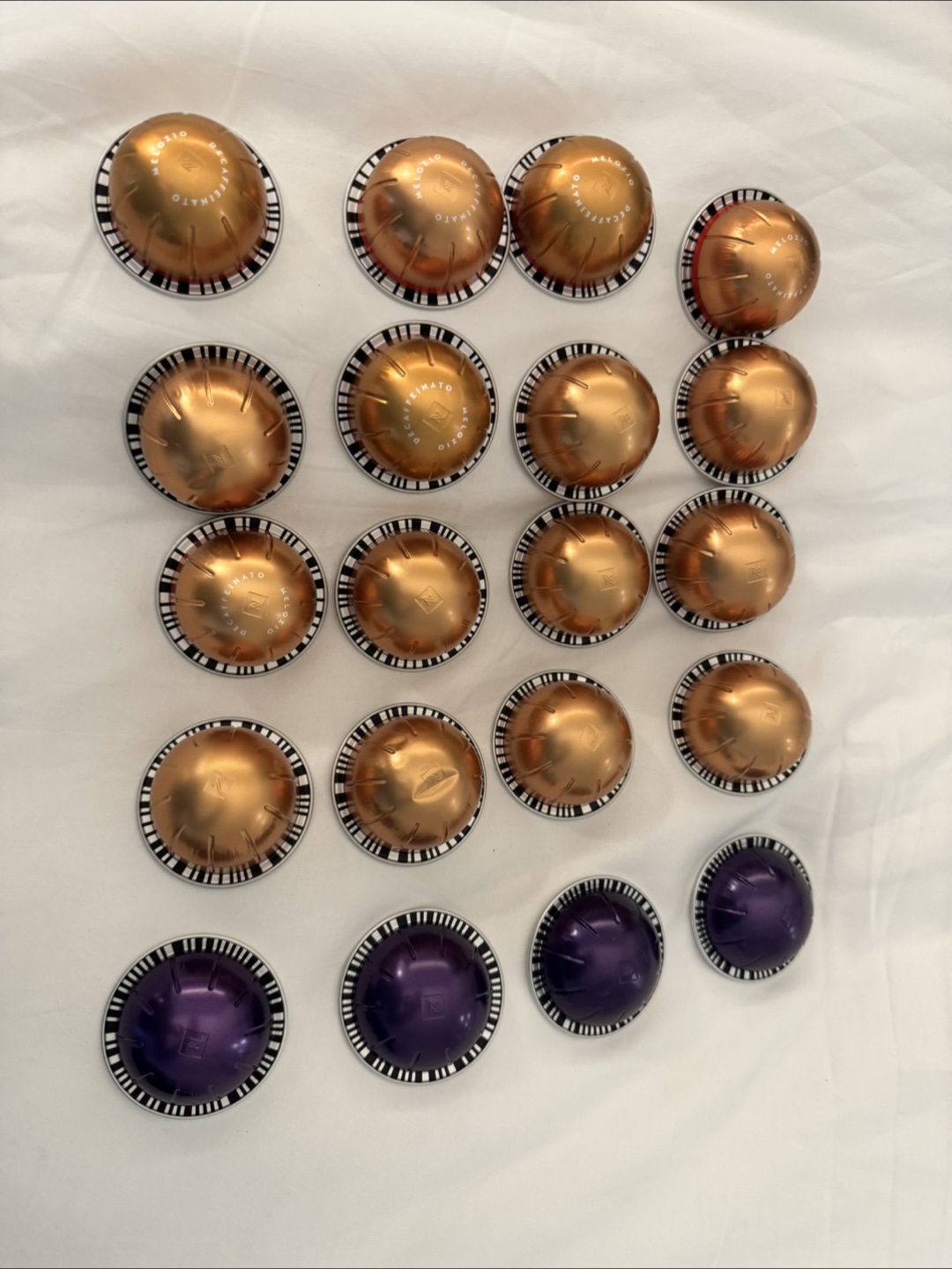 Here's a collection of Nespresso capsules ready for your enjoyment! You'll find a mix of • Melozio Decaffeinato (gold) 16