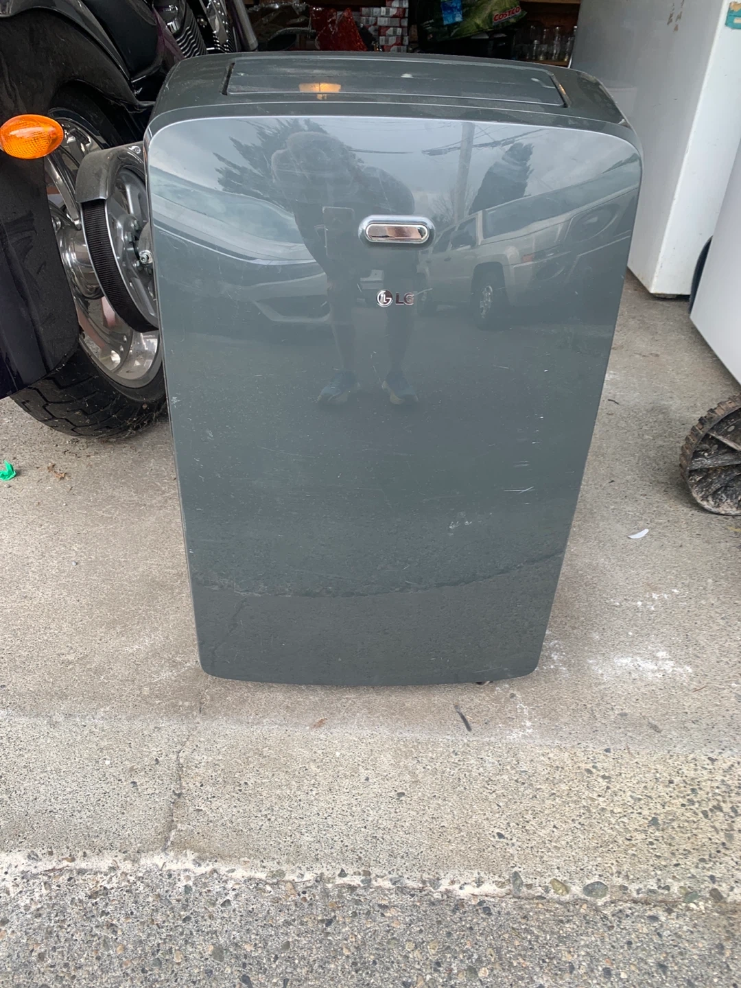 Portable LG air conditioner with 12,000 BTU cooling capacity. Features multiple fan speeds and a dehumidifier function. Includes original remote and window vent kit. Perfect for keeping your space cool on hot days!