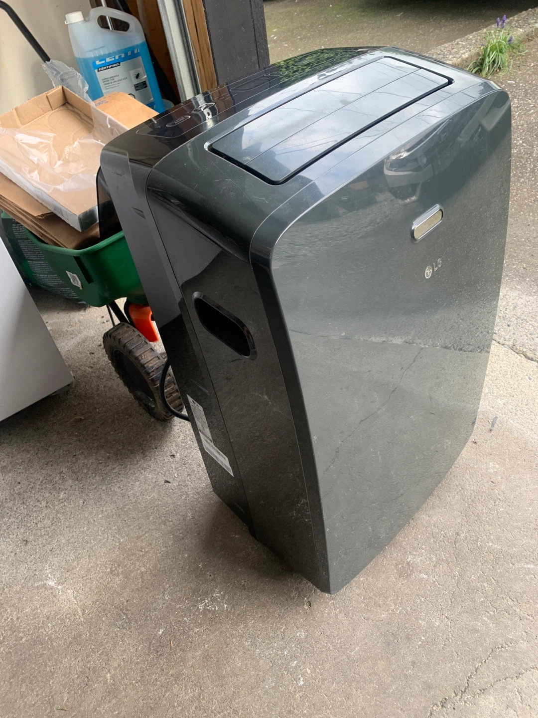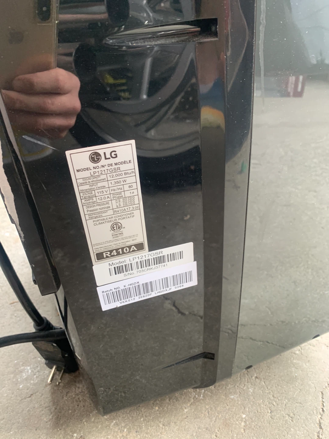 Portable LG air conditioner with 12,000 BTU cooling capacity. Features multiple fan speeds and a dehumidifier function. Includes original remote and window vent kit. Perfect for keeping your space cool on hot days!