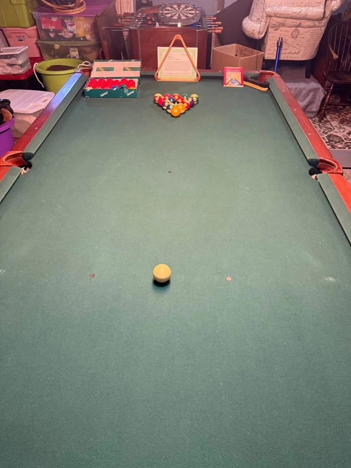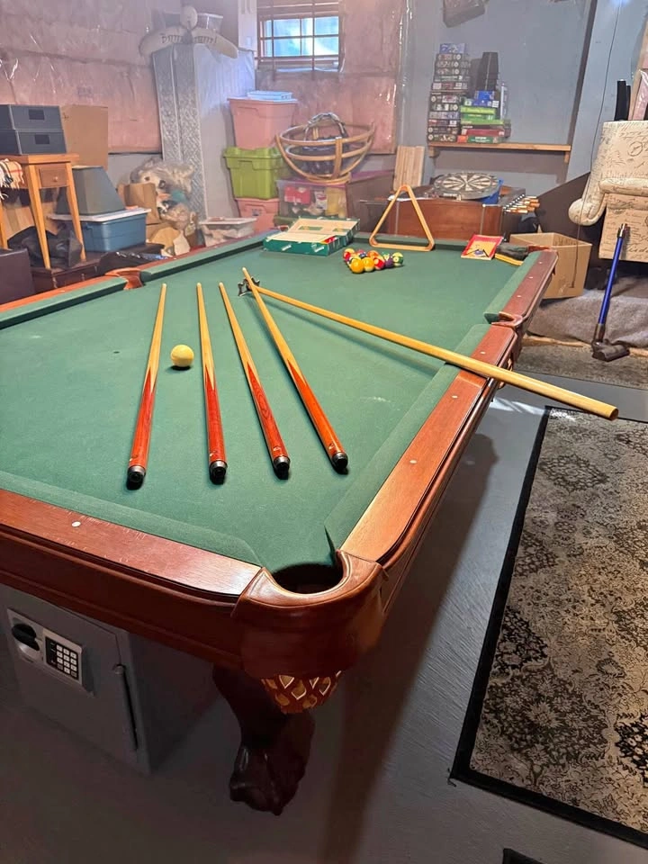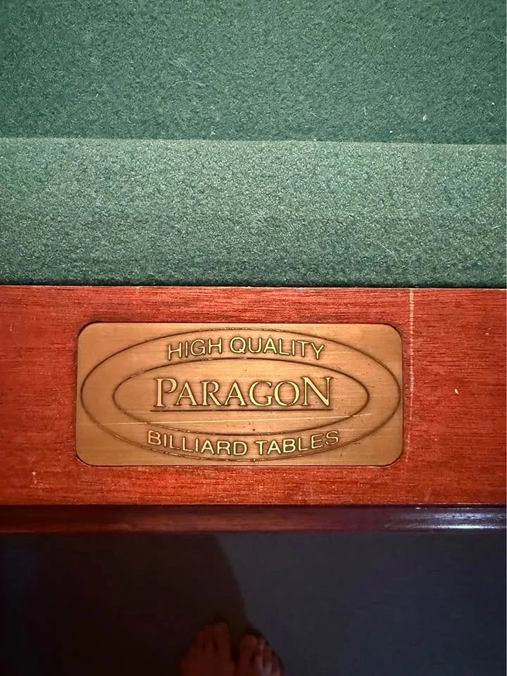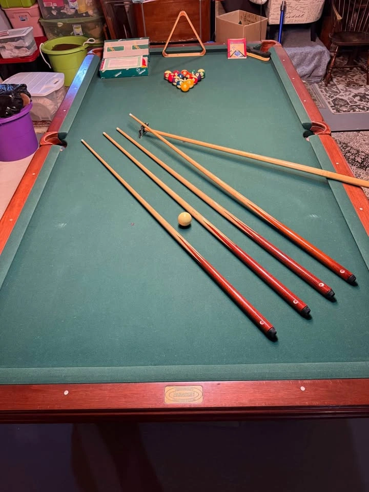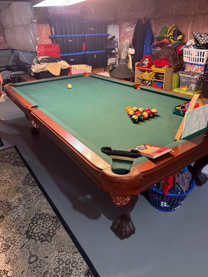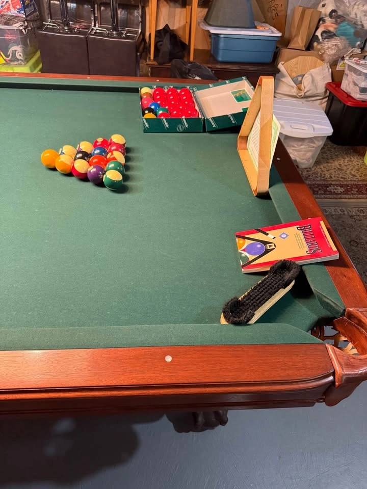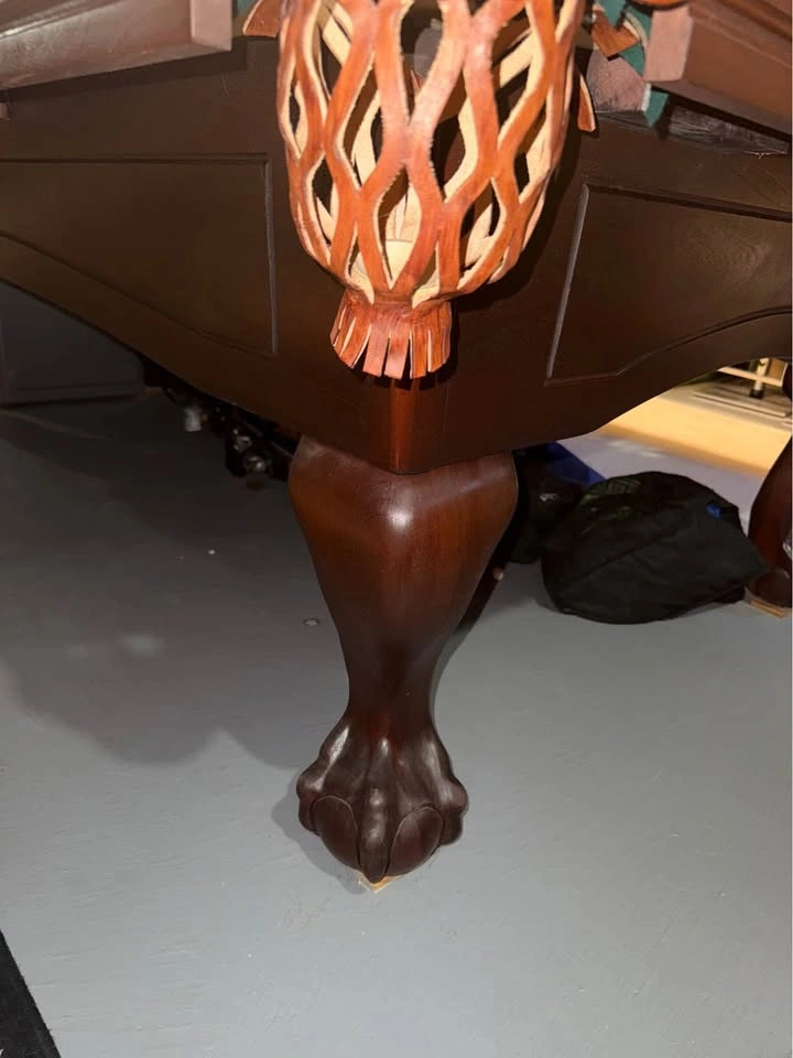 104.5 by 9 feet, eagle claw legs. Cues, rake and rack, pool and snooker ball sets included