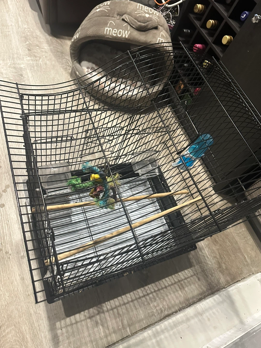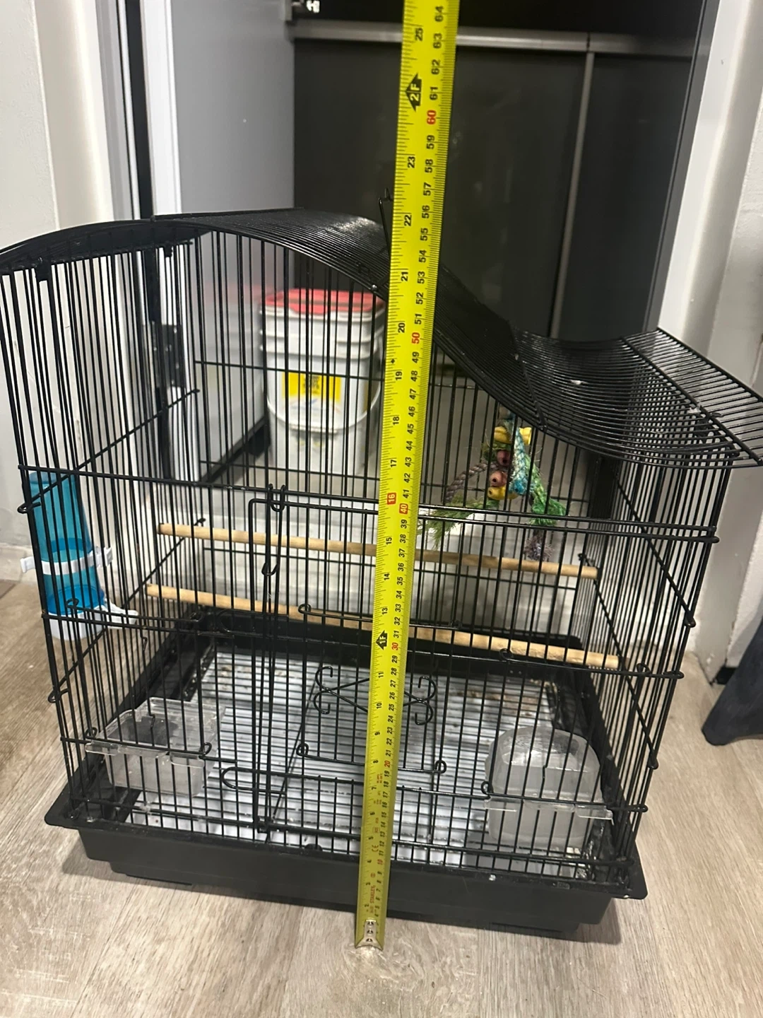 This is a black bird cage. It includes two wooden perches, a water bottle, and some colourful toys. The cage is approximately 22 inches tall and 18 inches wide.