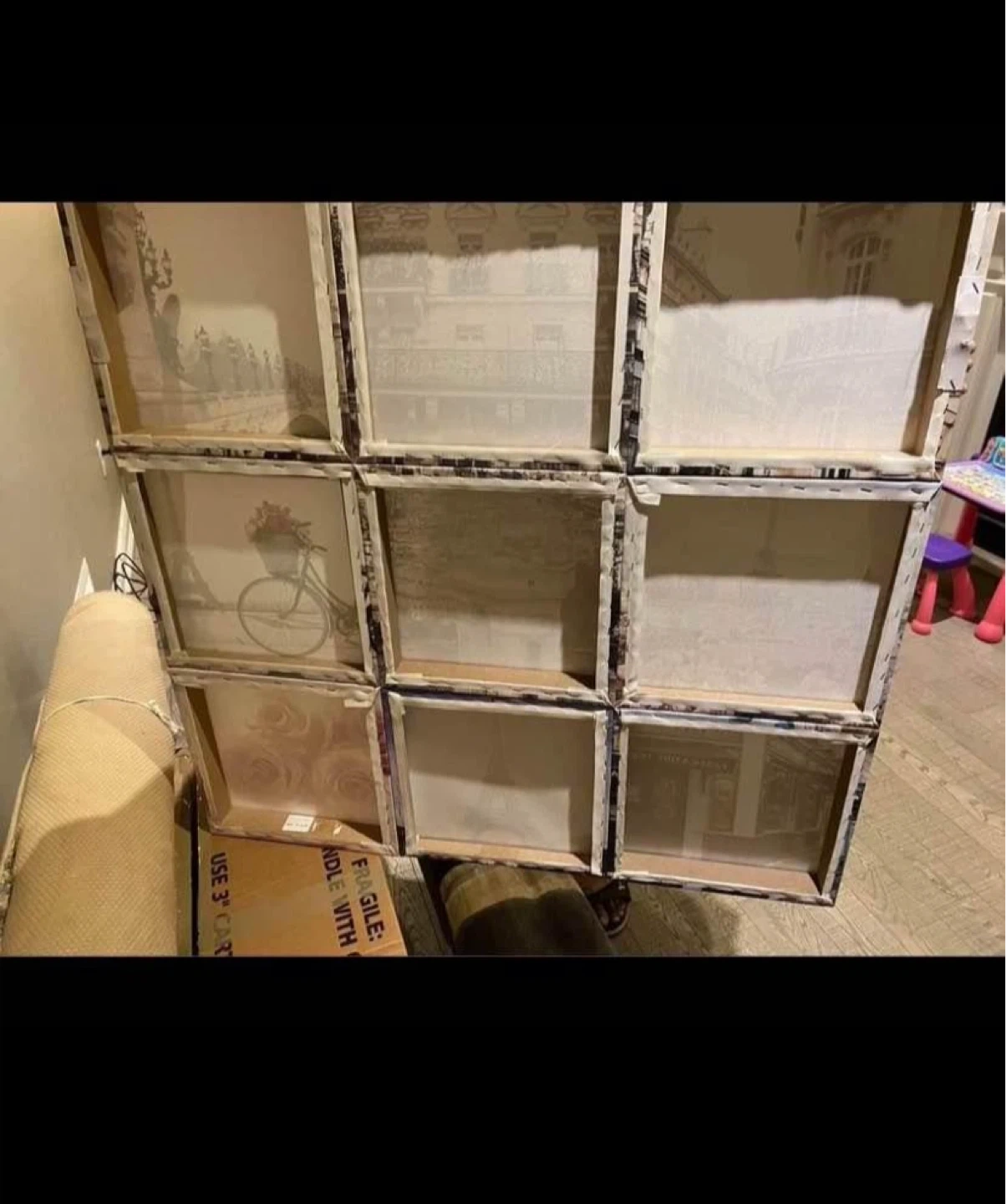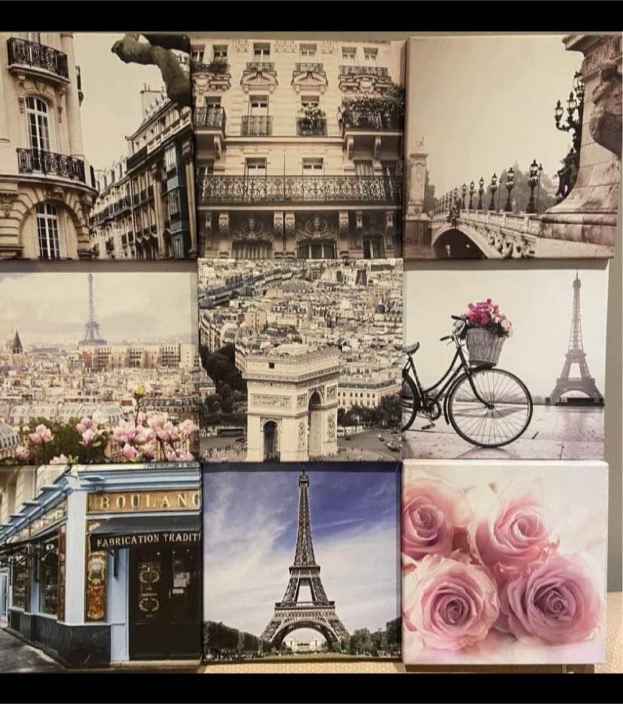 10Selling a canvas featuring scenes of Paris! These are perfect for adding a touch of Parisian charm to any room. Each canvas showcases different iconic landmarks and cityscapes of Paris. They're in great condition and ready to hang! Bought for $ 85 and taxes.
