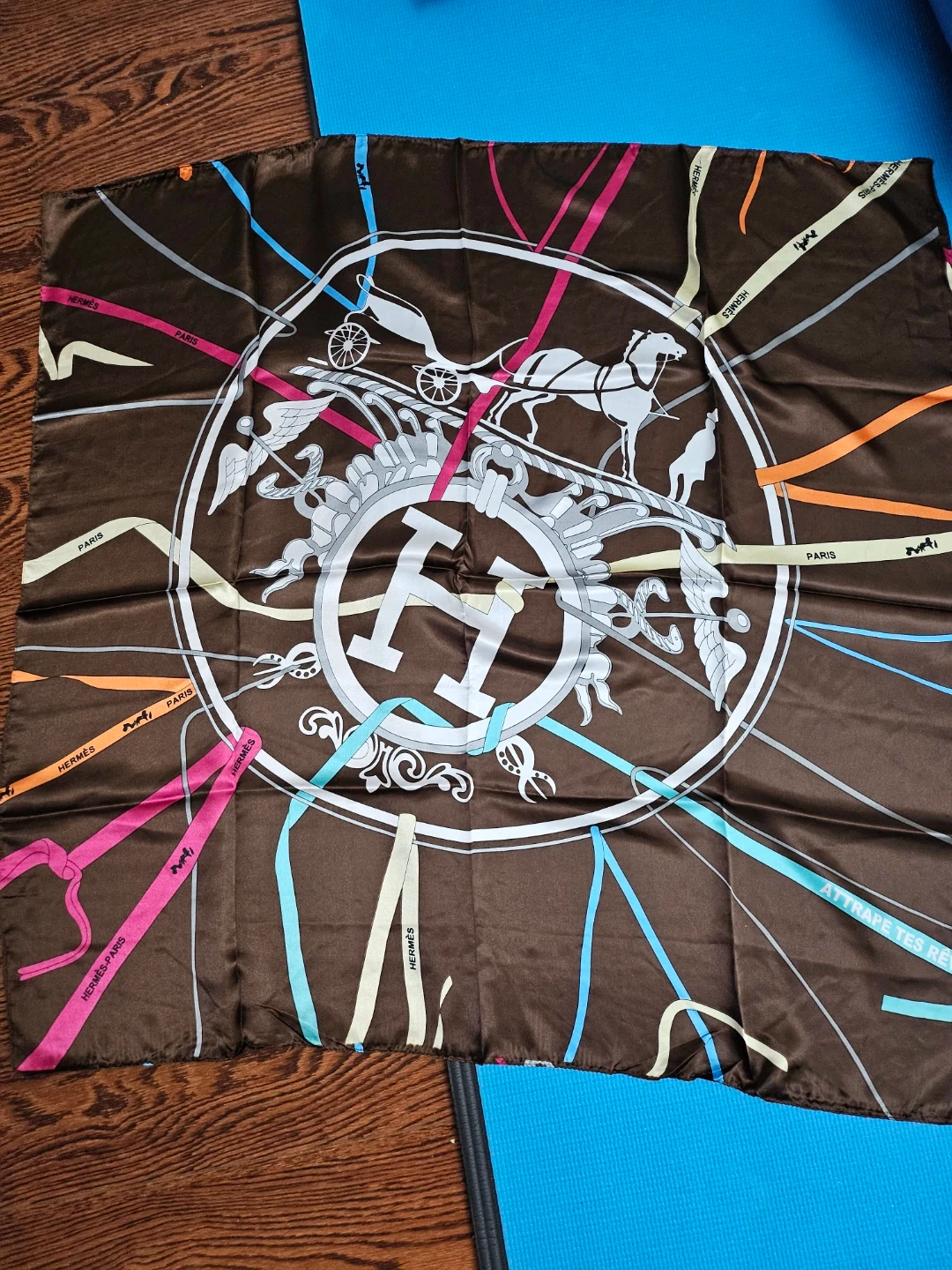 Selling a beautiful Paris silk scarf. It features a brown background with a colourful design including the inioc horse and carriage logo. A stylish addition to any wardrobe!